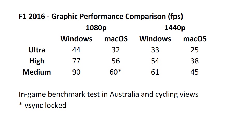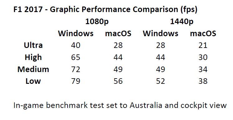 OK, so I've spent a lazy Sunday morning doing quite a few tests on the graphical performance of F1 2017 both on Windows and macOS.