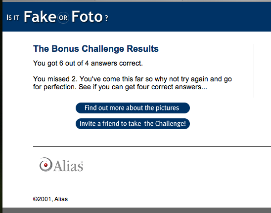 QuarterSwede macrumors G4 Oct 1, 2005 10,056 2,503 Colorado Springs, CO Mar 25, 2006 #58 10/10. Dust gave it away almost every time. The nails on the table was hard but what clued me in was that every head had the same markings on it. Bonus: 3/4. I thought for sure the dice were CG. Just such a great and clean shot!