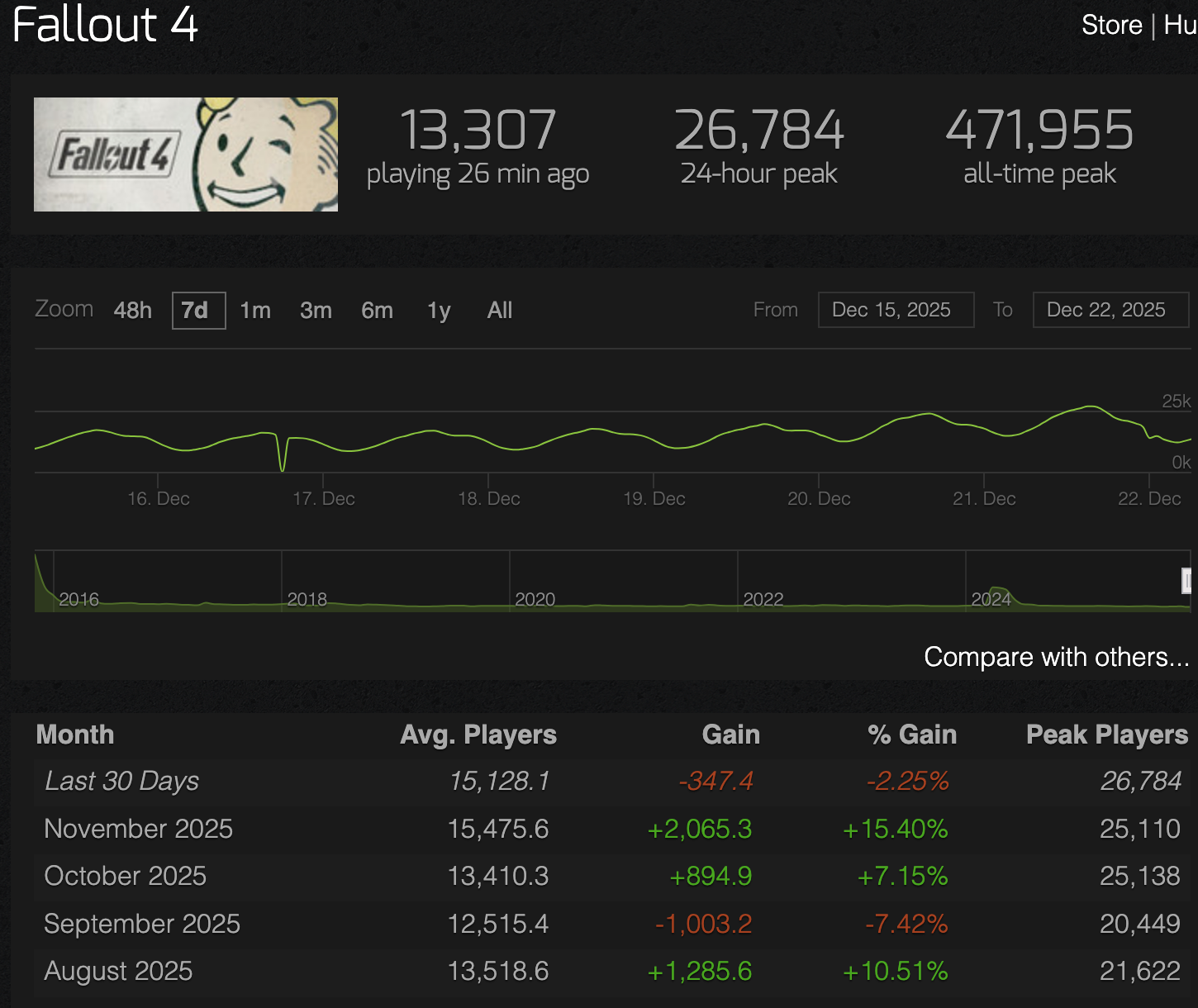 I do know I uninstalled F4, and have no intention to reinstall it for its own sake. For FO London, yes. Maybe again for FO California. In the meanwhile I have replayed F, F2, various FNV DLC and F3 DLC content since F4. Nothing like listening to Michael Ironsides lecture you in Honest Hearts, or stealthing across the Alaska wildy in Operation Anchorage. Now and then FT for the squad based combat and I like that aspect of the game. FNV is always installed so I can fire it up and go on a sniping spree for Legionnaires or their hit teams or sweep for raiders outside NV.