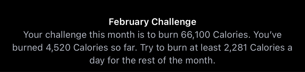 Hey thanks, appreciate you the positive affirmation. I got this watch a few months ago because I wasn’t exercising at all and I’ve closed all my rings every day since I got it, which has been a huge shift for me and I feel great. Doubling that so soon feels a little out of reach for me, but maybe that’s just the push I need to get myself to that next level. Only one way to find out!Mine is 30 min which I double most days also...doesn't mean '60 min' all at once...I do 30min. on exercise bike along with 10mi CORE and 10mi HIIT and ....walks or more bike or Functional Strength ...blah , blah, blah. Point is you don't have to do 60min (or whatever the amount is ...) all in one setting. And if you don't make it on some days....big deal: you're already ahead for trying! Lots of days I do 90 or more minutes of exercise. My February Challenge is 27,900 active calories. So far as of today at 7,902. I think I can do it....and if I don't? I'll try and do the March Challenge! (whatever pain that might entail 😀!).