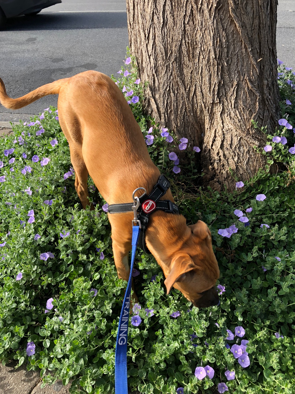 The first garden bed we get to on departure for that Friday & Fenna's already tempting fate, climbing in & having a damn good sniff of the street flowers, which are buzzing with bees... She wasn't interested in chewing on any this time.