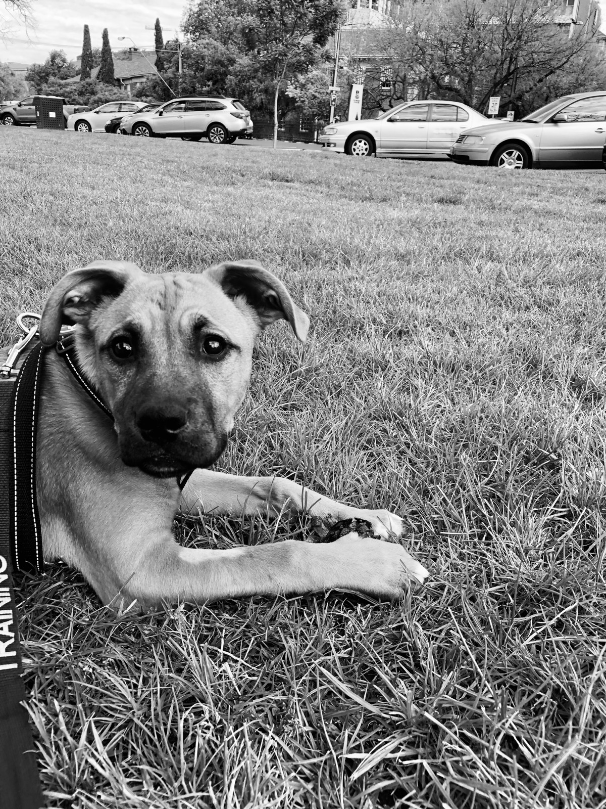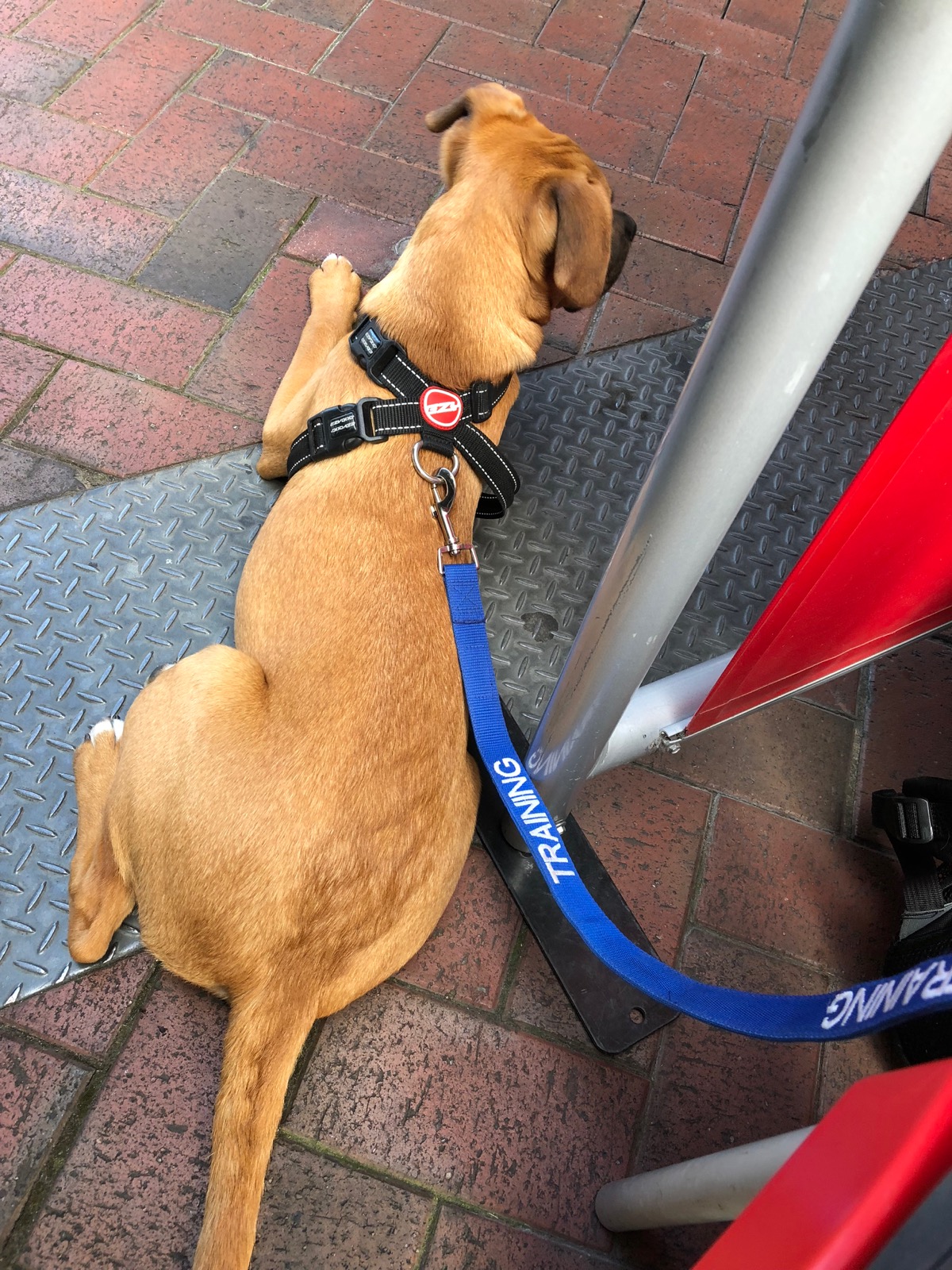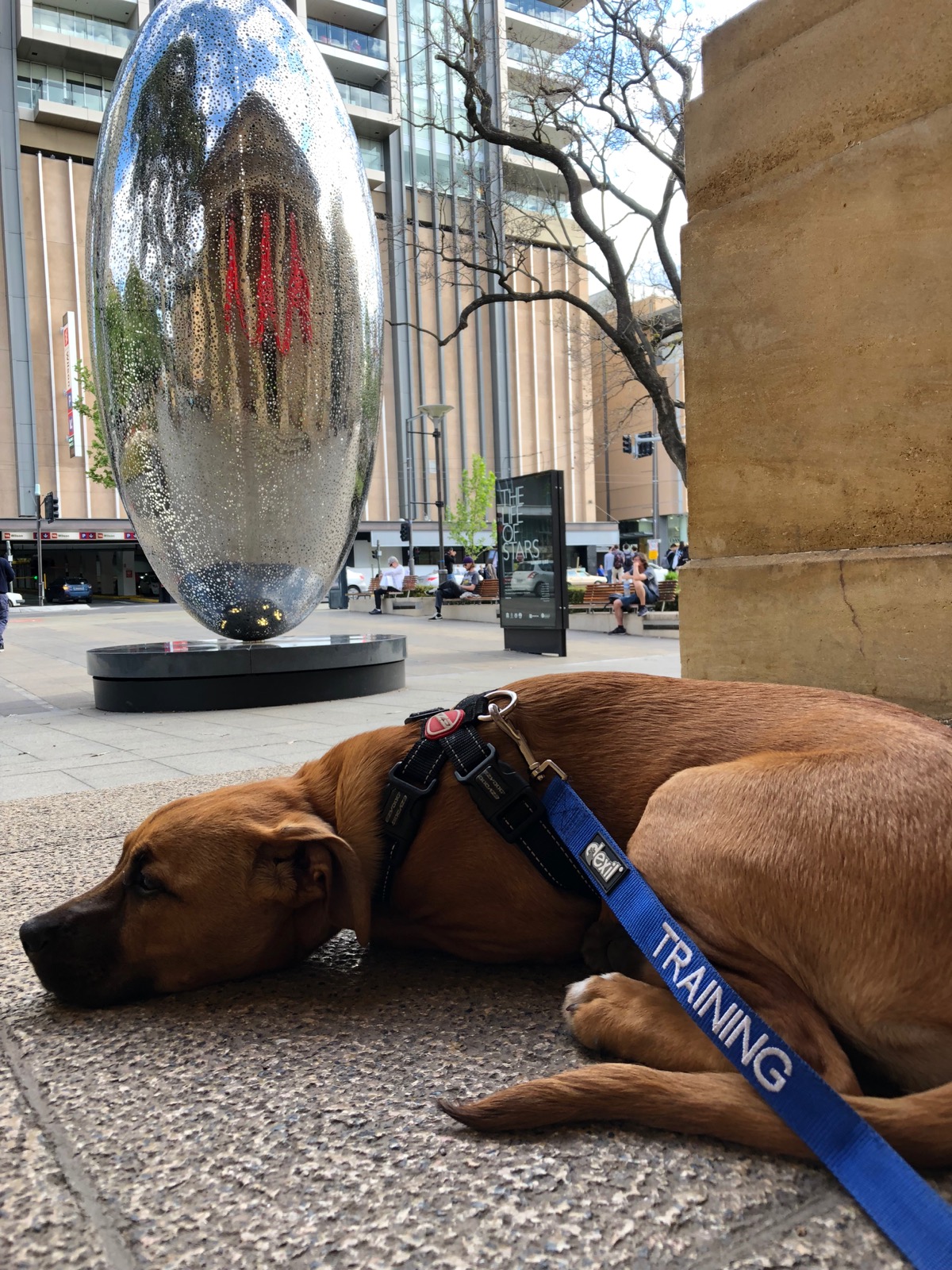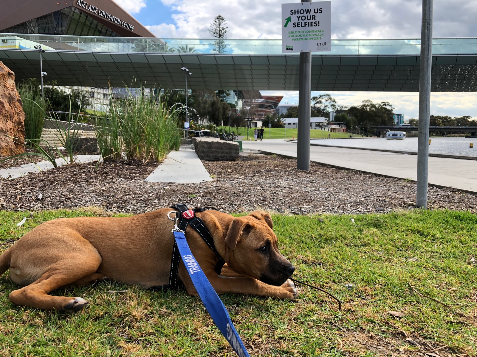 After a full day festival for mental health, we went for a stroll through the parks & along the riverway. She loved the waterjets in the background here that you can just make out. She loves streams or jets of water, but I can't let her play like that at home with the hose as it actually causes all manner of obsessive issues, which would then make training a problem later on... But apparently these type of waterjets are okay for her, as it's not operated or held by me!
