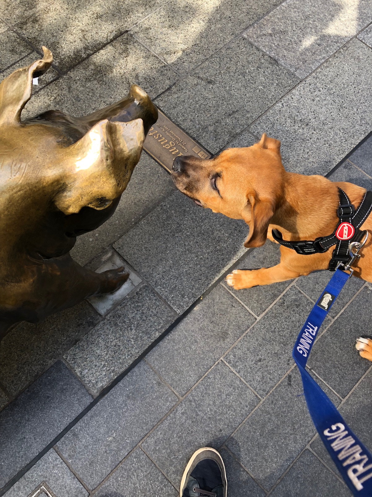 In the major shopping strip in the CBD here, which is an outdoor mall, there are these famous pig sculptures. Fenna had no idea what to make of them & took some coaxing & reassurance from me that they were okay, before she would even get close to them! I think she was waiting for them to move. This is her almost ready to sniff the snout of one.