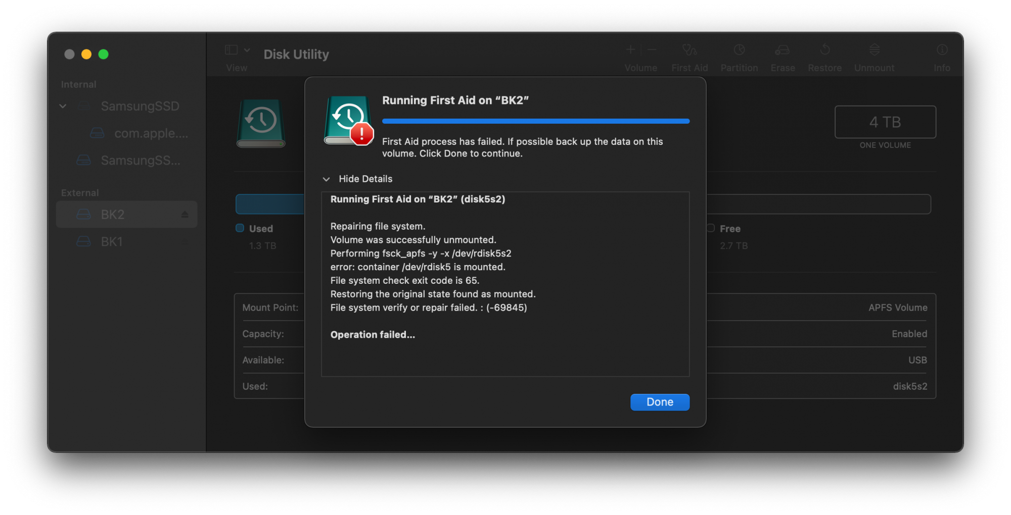 So I use Disk Utility to perform first aid on my two backup HDs. Then I got the following error: