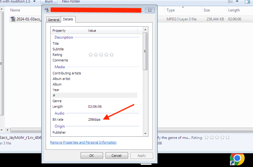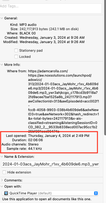 When I'm curious about the bit rate of a given MP3, I can't find it on Mac. It's easy to find in Windows: Properties > Details (screen shot) but on Mac Comand>Info only shows the 'Sample rate' which is not the same. (2nd and 3rd screenshots)