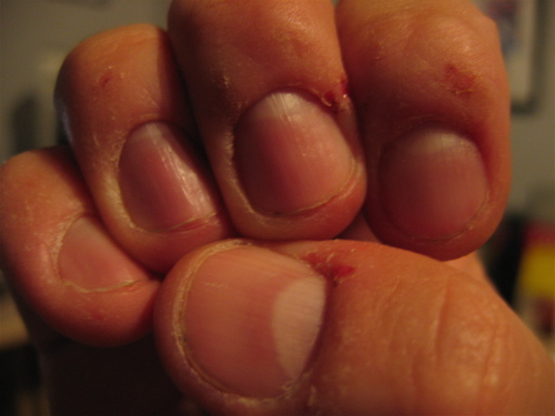 Well, OK, most folks' ovals are longer than they are wide. Mine are about twice as wide as they are long. And most people have a kind of strip of white between where the nail bed ends and where the fingernail ends. And most folks have nails that go out at least a millimeter beyond the end of their finger. Mine stop about 3-4 millimeters before the end of the finger. I have fingerprint-whorls on the skin on the top of my fingers, the skin between end of nail and end of finger. My nail beds (what's left of them) go all the way to where the fingernails end, and a good portion of the time a bit beyond (drying out and dying & retreating).