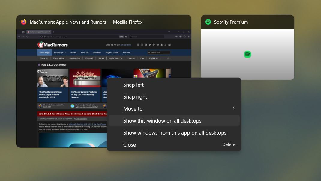 Note, if you select the "Show windows from this app on all desktops" option, that will stay marked during future Windows sessions until you unmark it again. With that selected, you can also still select individual windows to only show on a specific desktop (handy for something like Outlook where I might want the main app open on all desktops, but an e-mail related to a task that is on one specific desktop can be kept just with that desktop).