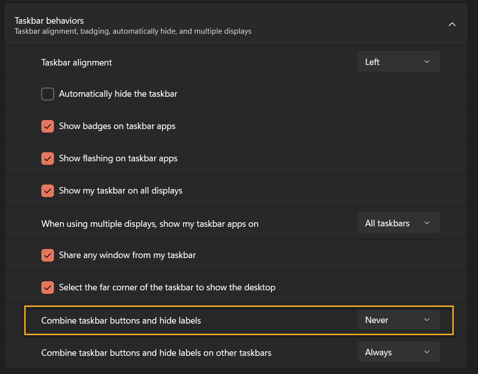 3) Then finally, set the "Combine taskbar buttons and hide labels" setting to either "Never" or "When Taskbar is full":