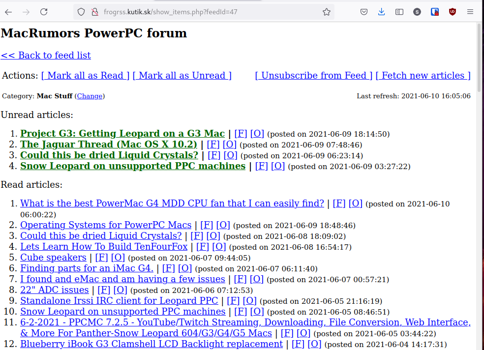 Based on ideas of FrogFind! and 68k.news I've built an full fledged RSS aggregator/client usable on and vintage Macs and very old browsers. I've successfully used it with Netscape 4.7 on System 7.5 .
