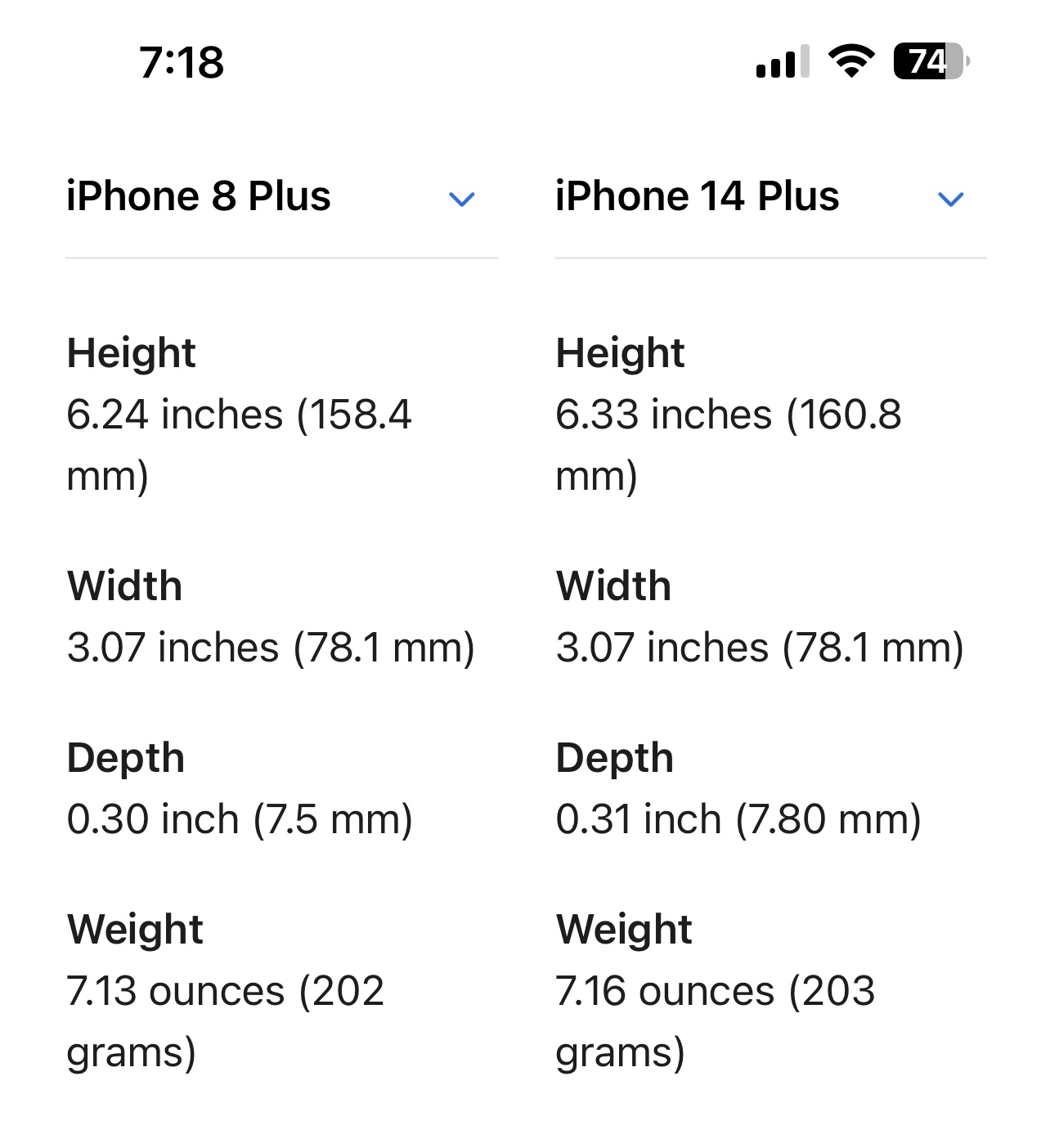 This is because the display size is a diagonal measurement (corner to corner) and so on the 14/14+ also includes areas where the 8+ now has bezels. However, when watching full 16:9 aspect ratio content (e.g., movies) on the iPhone 14, the picture will actually be smaller than on your iPhone 8+ (longer diagonal measurement, but smaller width for viewing in 16:9). Whereas the 14+ will match the 8+ 16:9 aspect ratio size because the case (and display) is the same width. With that said, on the 14 and 14+ you can also watch a movie in "full" display (no bezels), but it wont be in 16:9 and some of the viewable content will be cut off above and below.Hmm… Very interesting.