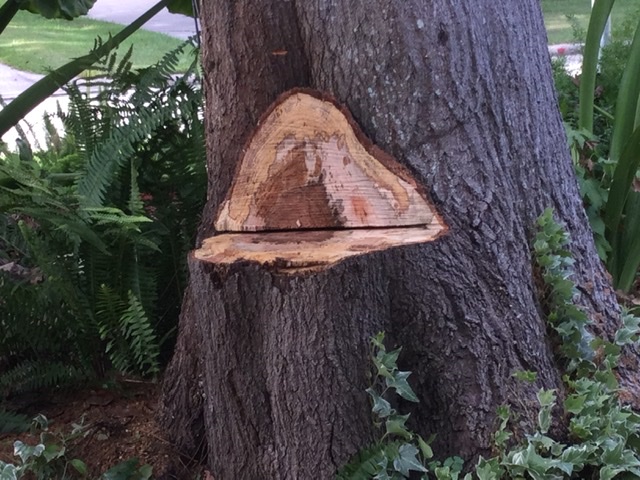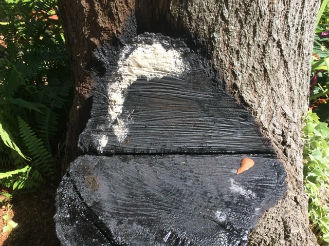 Out front we have a large tree that that was 2 trees that grew together or a single tree that grew with two trunks joined at the base. About 3 years ago one of these trees was leaning precipitously over the house and we decided to remove it, cutting above where to two trunks joined leaving a stump. I read that a good thing to do was let the cut heal on it’s own.