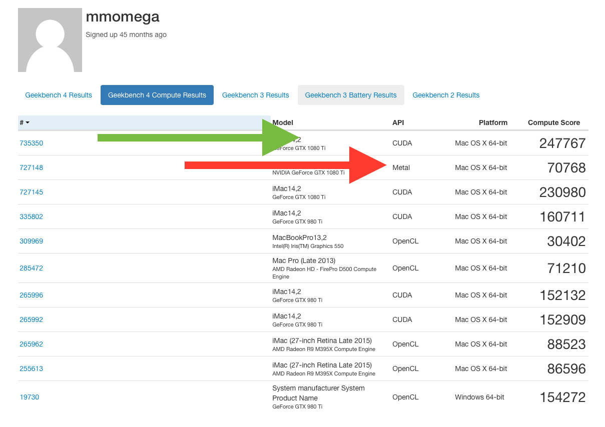 This is an incorrect assessment of the situation. TFLOPs is a measurement of raw computational power. If the RX 470 has more TFLOPs than the D700s, then it has more raw computational horsepower. However, this raw power is very rarely the bottleneck in benchmarks, for both OpenCL and OpenGL/Metal. Many OpenCL benchmarks have been written for or tuned for the AMD architecture, and thus run extremely inefficiently on the NVIDIA architecture (since they are fundamentally different). Most compute code written/tuned for NVIDIA uses CUDA, as it exposes more of the underlying architecture to the application. There are a few OpenCL examples like Oceanwave and a face recognition benchmark that run much faster on NVIDIA than AMD, but again, that's probably because they were written on NVIDIA and thus have an implicit bias for that architecture.