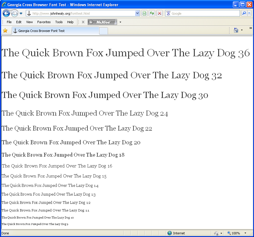 I've uploaded a simple font test page to my site that shows Georgia from 36px to 9px. Could some kind souls here please take screenshots of the page and attach them here with notes on OS and Browser versions?