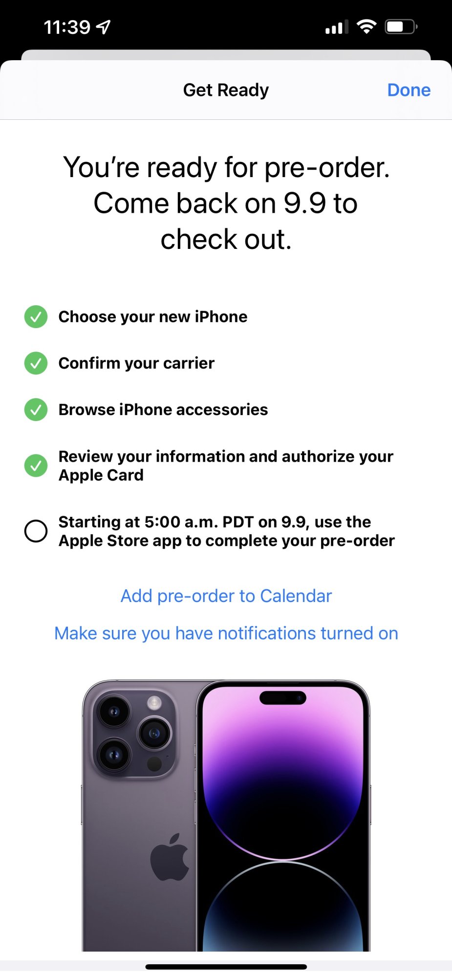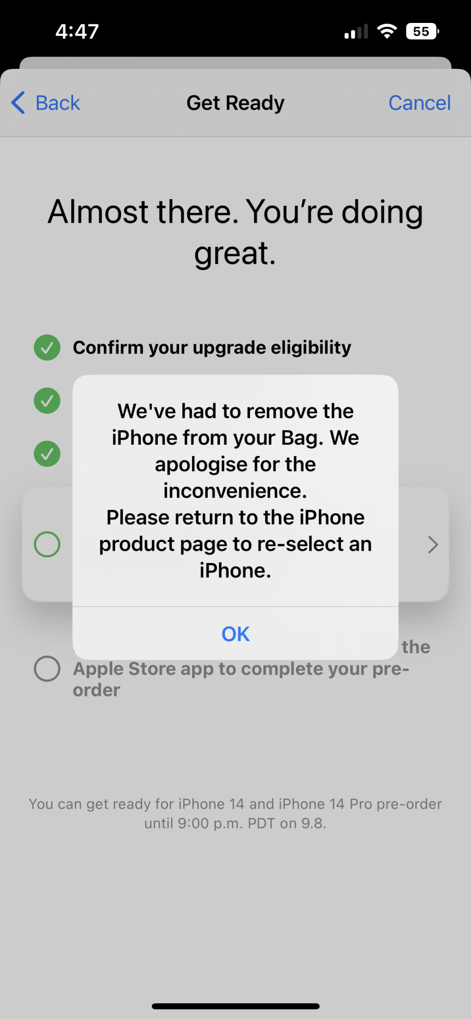I'm having trouble completing the "get ready" process for pre-orders this Friday. Has anyone else encountered this message in the Apple Store app? I also tried on desktop and still getting an error. I'm on Verizon for what it's worth. Seems like it's only happening for the iPhone 14 Pro Max 1 TB in gold.