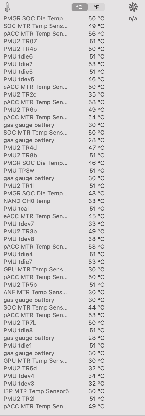 Here's what I get in iStatistica on my M1 Macbook Air. I don't know which sensor is what. I'm compiling code in the background.