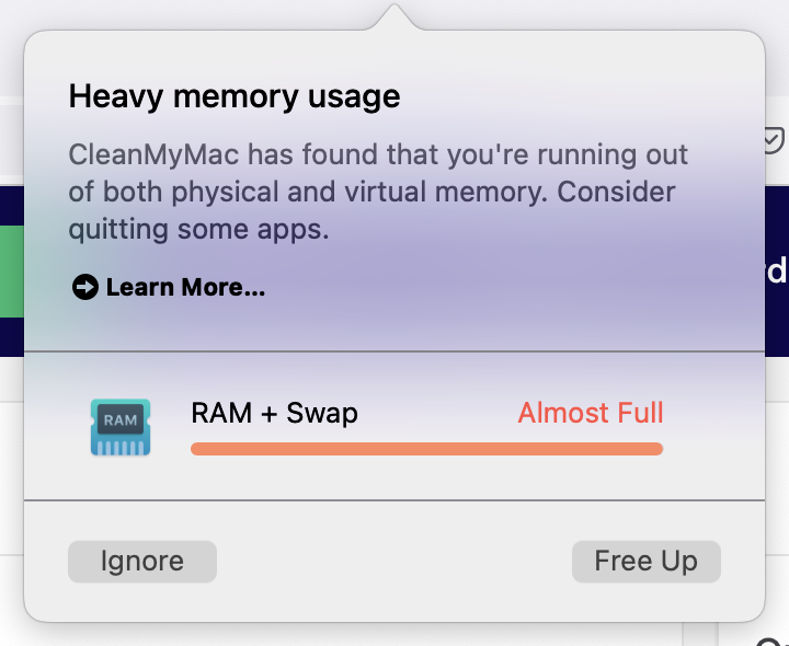 This is correct. I have a 16GB M1 Macbook Pro and I used to get the same error. I got rid of CleanMyMac and I have had no issues at all.Get rid of CleanMyMac.