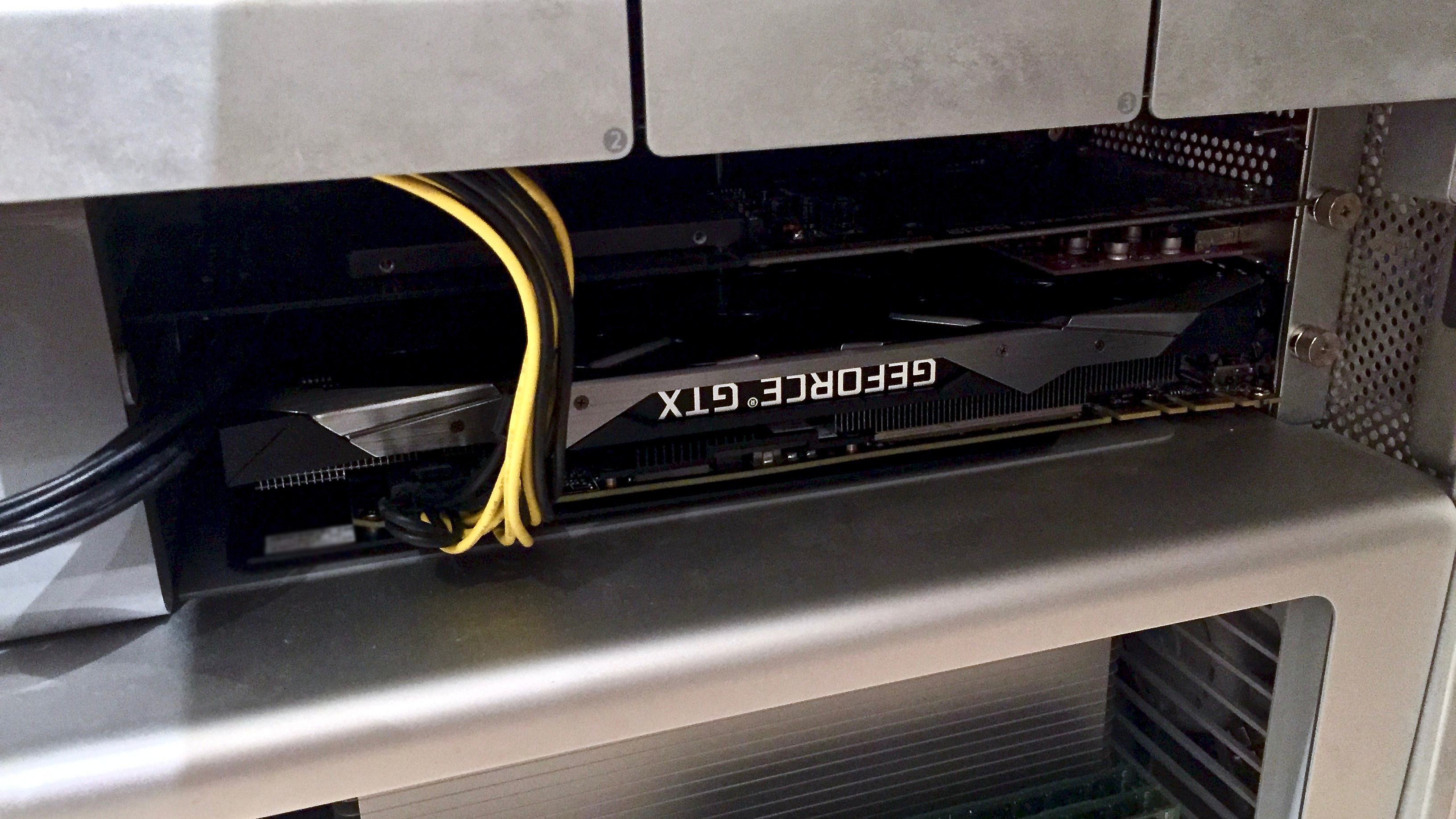 The card is very long, but perfectly fit inside the cMP's PCIe compartment slot 1 (with the back plate ON). And this card is "just" a dual slot card. Most of the after market 1080Ti is 2.5 slot card, which I would like to avoid.