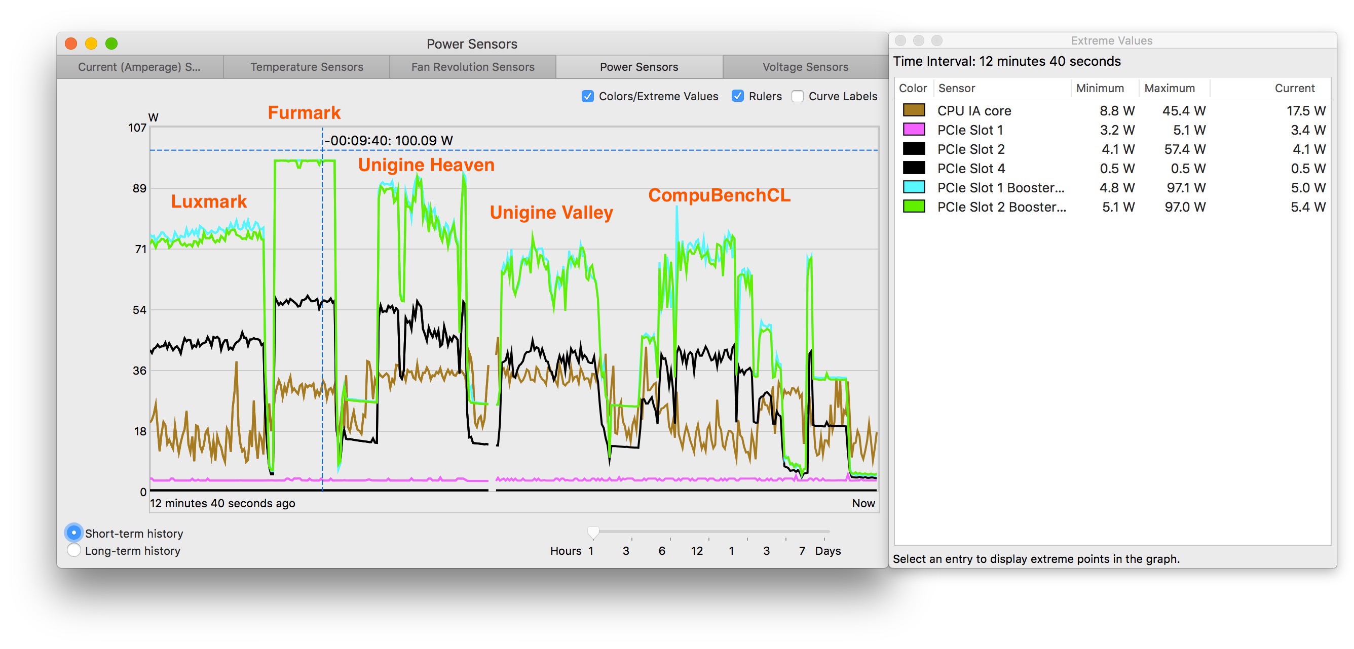 This card works fine with just dual mini 6pin including Furmark. For some reason, even though I use a bridge between the card and the mini 6pins. The power draw is not that perfectly even (but it clearly help a lot). From my observation, the difference vary between 2-10W (update: these power draw difference is slot related, the cMP count some of the slot 1 power is drawer from Booster 2). So, since one of the mini 6pin shows the power draw is varying at ~95W under Furmark. I suspect the other one is fluctuating up to around 105W (just a bit above the display limit 97W). With another 60W from the slot. Totally ~260W, pretty much as expected. And since Luxmark and Unigine benchmarks shows the power draw rarely go above 90W from either mini 6pin. That's pretty much representing normal daily very high demand situation. Therefore, even though CUDA-Z heavy test can still shutdown my Mac (I tested it myself). I am still very happy with the power draw (and the distribution). It's well within my own comfort zone.