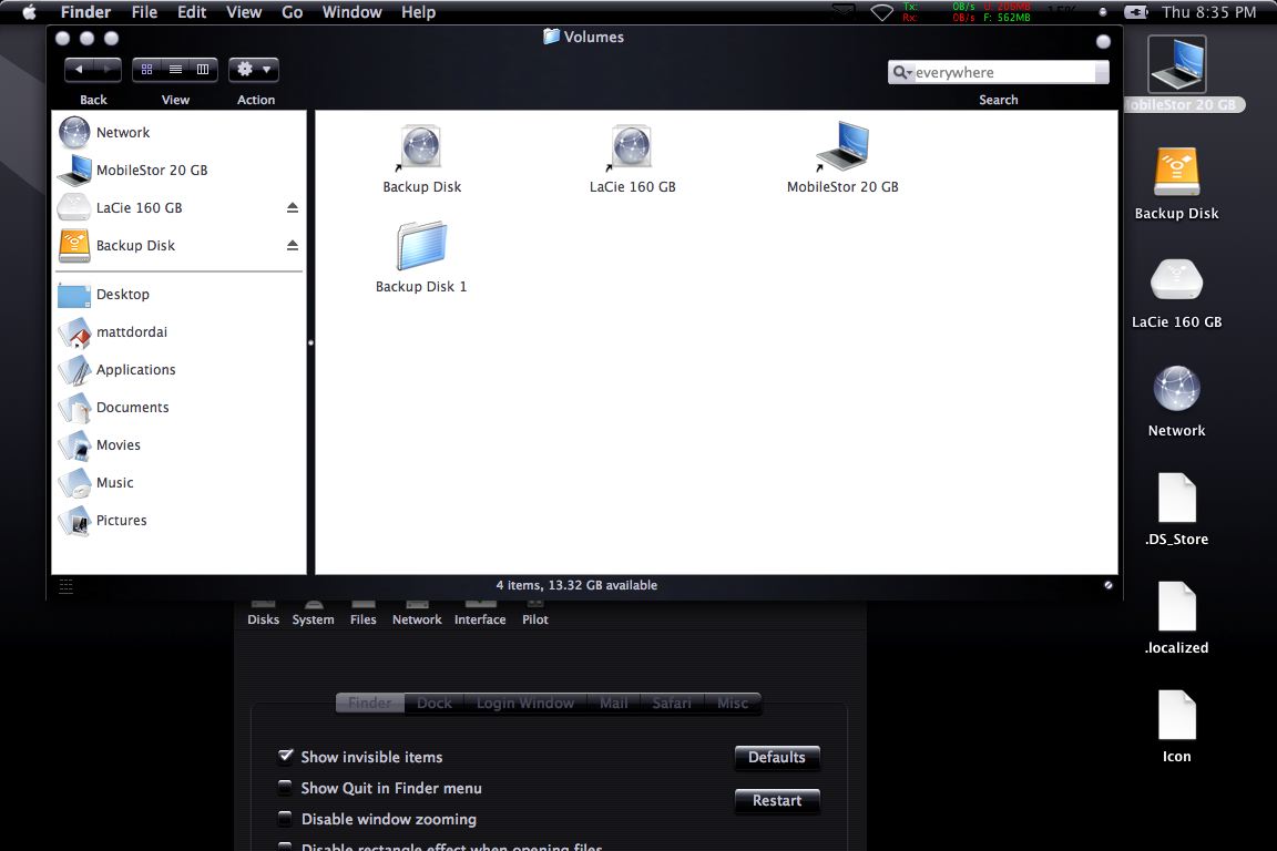 I first noticed the problem that I have now when I was downloading a fairly large file on safari. The finder alerted me that I was low on disk space, and sure enough, when I checked, I had about 100 megs left. I know before i downloaded the file I had about 10 gigs free and the file was only 1GB. I moved some extra things that I didn't need onto my external hd and off of my internal one. After that, it said that I had about 3.5 gigs free on my internal HD.That still wasn't right. I used carbon copy cloner to copy my entire internal HD to the backup partition on my external HD. I erased the backup partition before I did this. I checked the backup partition and it said that it had 11 GB free. The backup partition and my internal HD are both 20GB.. If I select all of the items on my hd and select Get Info, it says that they take up 4.65GB but it says that I have 3.54GB free on the window. It says the came thing in the activity viewer. I restarted, repaired permissions, and reset the PRAM. Argh! Why doesn't it work?