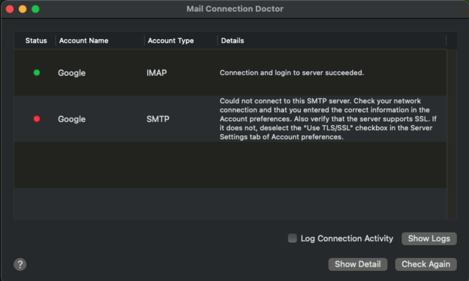 What I’ve tried so far: Restarted the computer; Rebuilt Mail database; Removed my Gmail account from Internet Accounts in System Settings and re-added it; Used custom outbound settings with Gmail’s SMTP and IMAP settings in the Mail app; Used several different DNS servers.