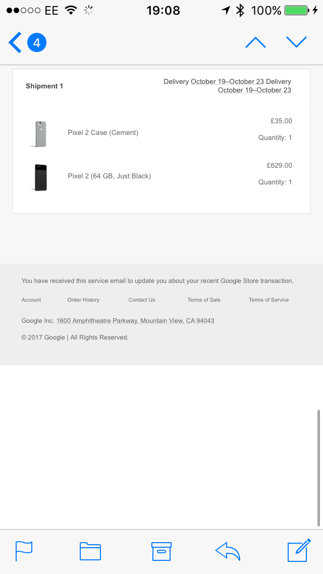 my 'Just black' 5" Pixel 2 is arriving 19th to 23rd Oct with light grey fabric case.