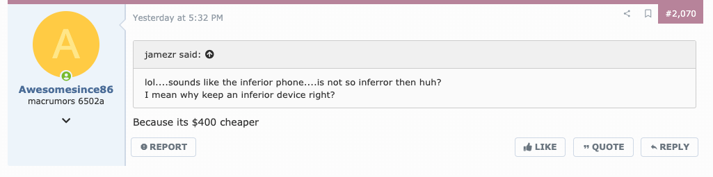Lol exactly, I never said the phone is inferior because of the cost. I said the phone is inferior but I would still consider using it because of the cost savings. Cost has nothing to do with if it's better or worse and I never said it did.You said