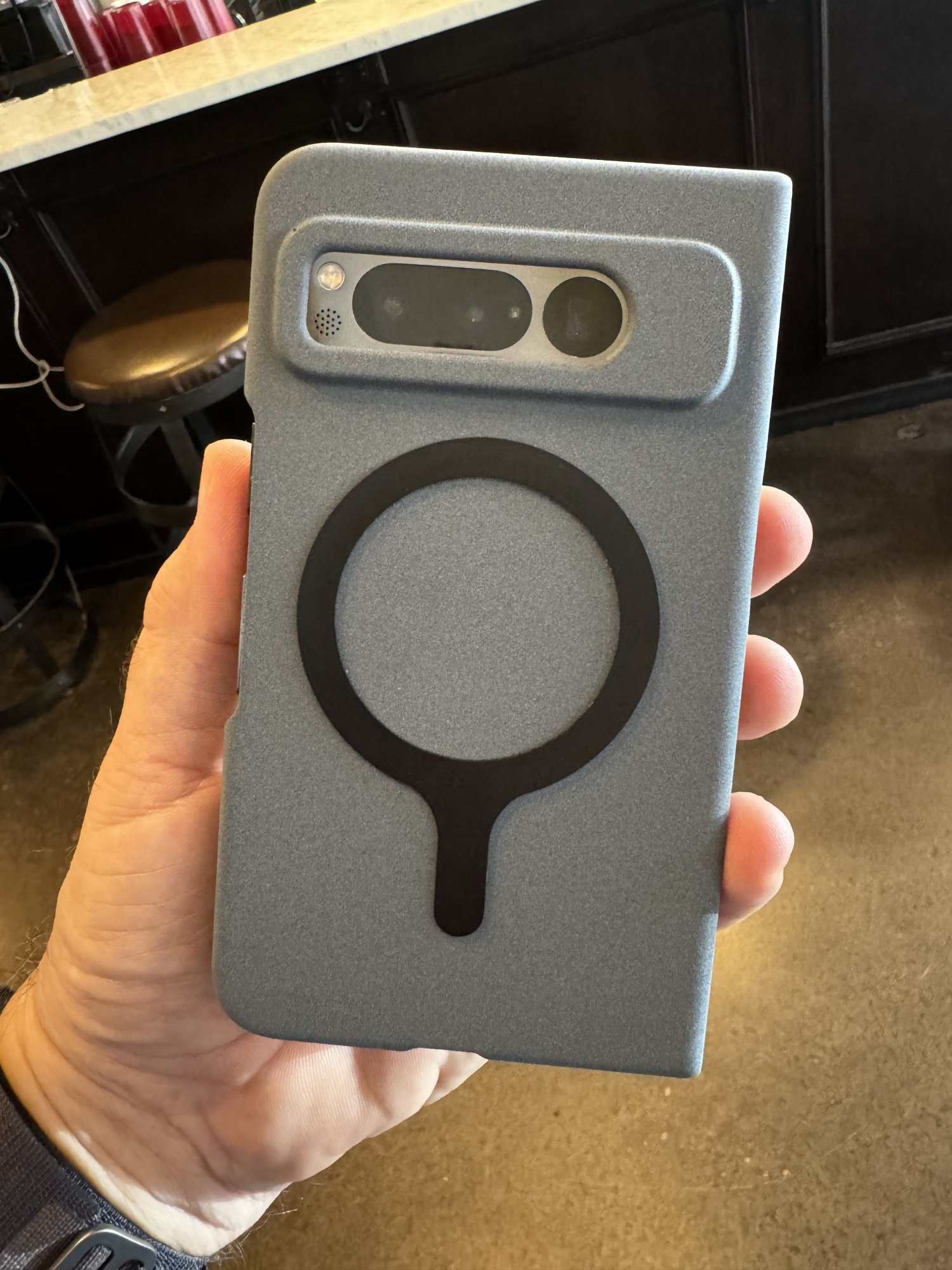 The ESR ring comes with a little plastic nub that fits in the usb-c port on the phone and holds a guide along the back of the phone to help you determine where to place the ring. They don’t have one specifically for the Pixel Fold but did for the smalled Galaxy S22/23 so I used it and confirmed the location worked with a magsafe charger before adhering the ring. The case has a matte finish with a subtle amount of texture which feels great and so far, the ring is sticking to it.