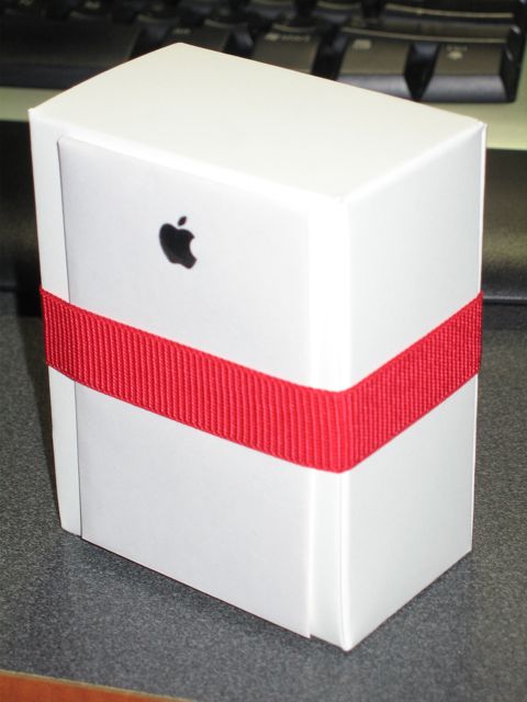 Nicely wrapped. Gift packed. Red bow. White box. With a card.