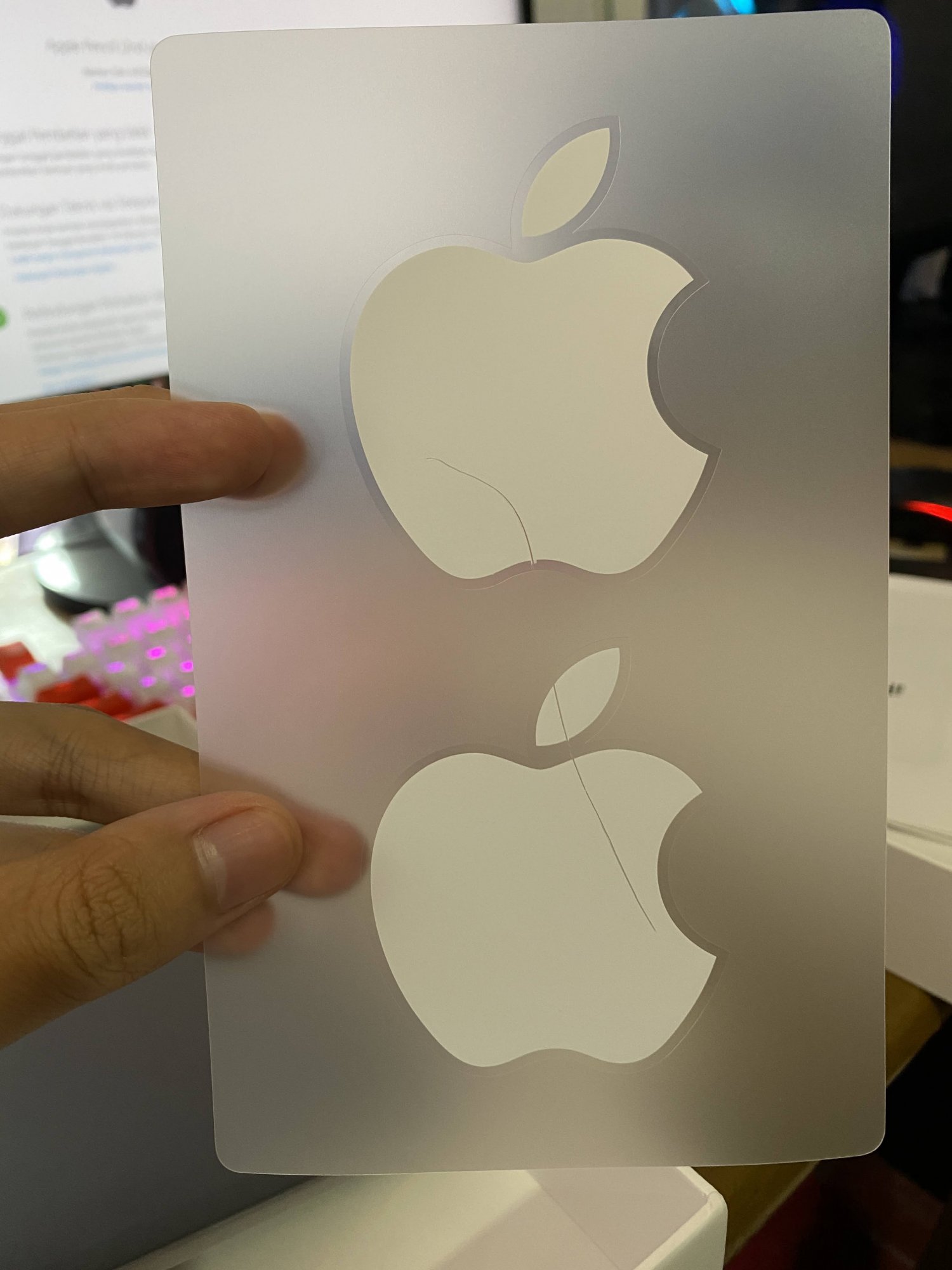 But the funny thing is, I got a broken apple sticker, like it was scratched by a sharp object.
