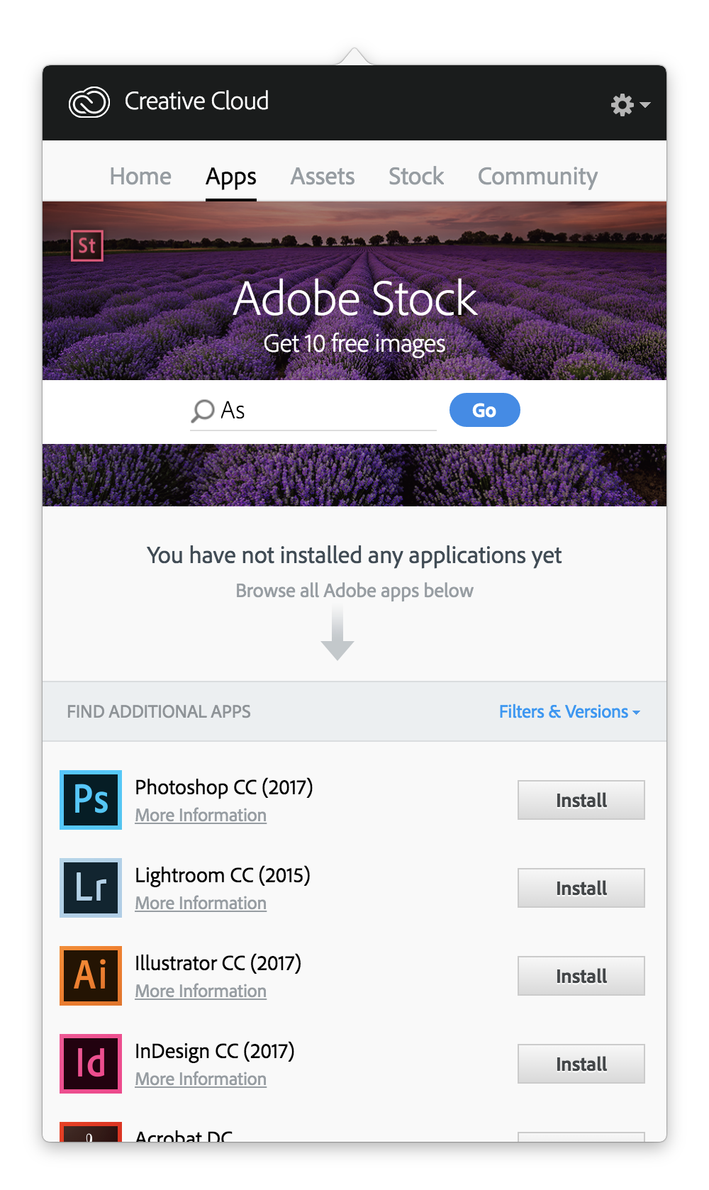 I didn't even get around to installed any Adobe apps this time, just the CC Desktop client which lives in the menu bar and allows you to install all the various Adobe apps.