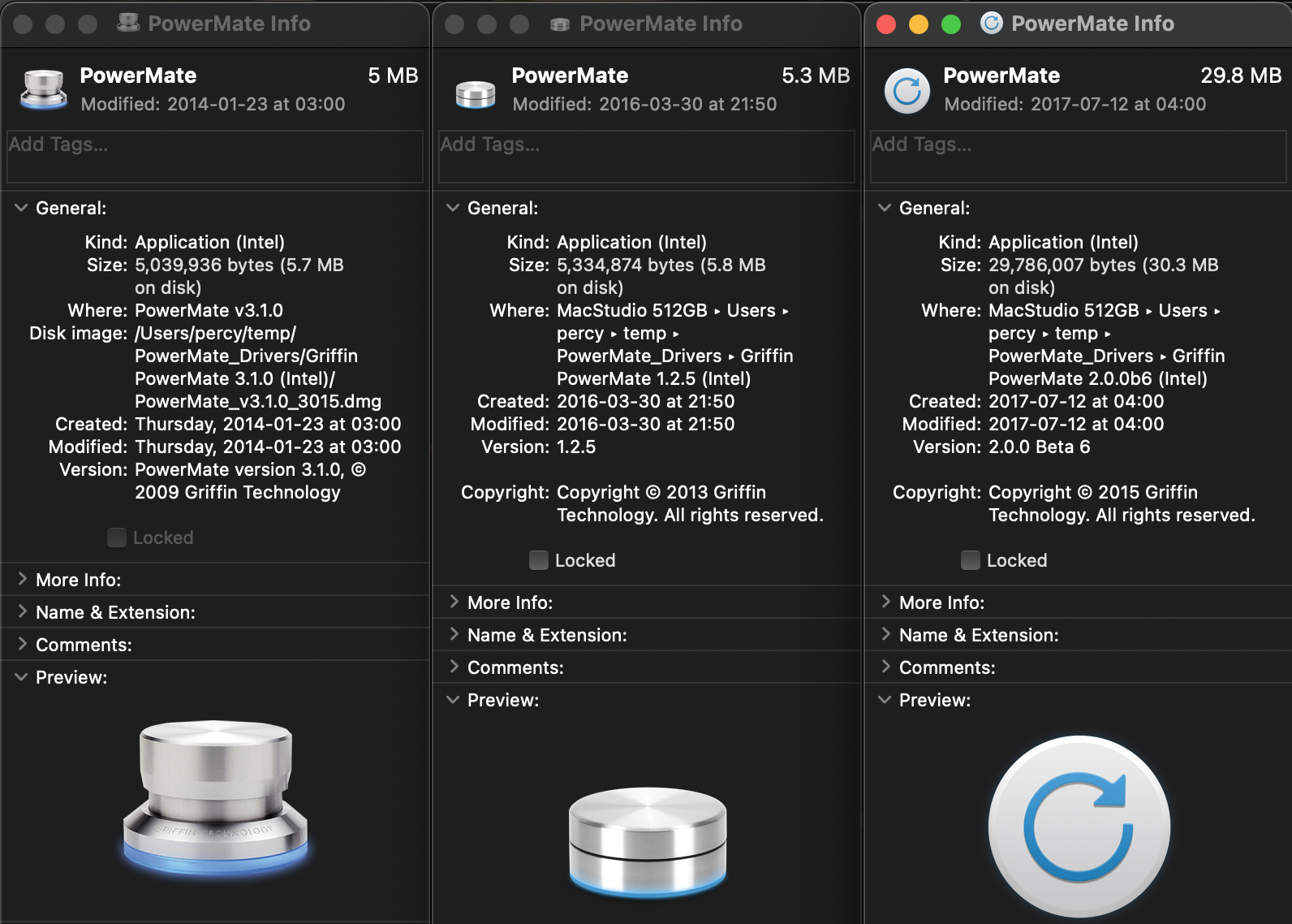 I dug out 3 different version of the PowerMate app coming from different eras of supported OS X.