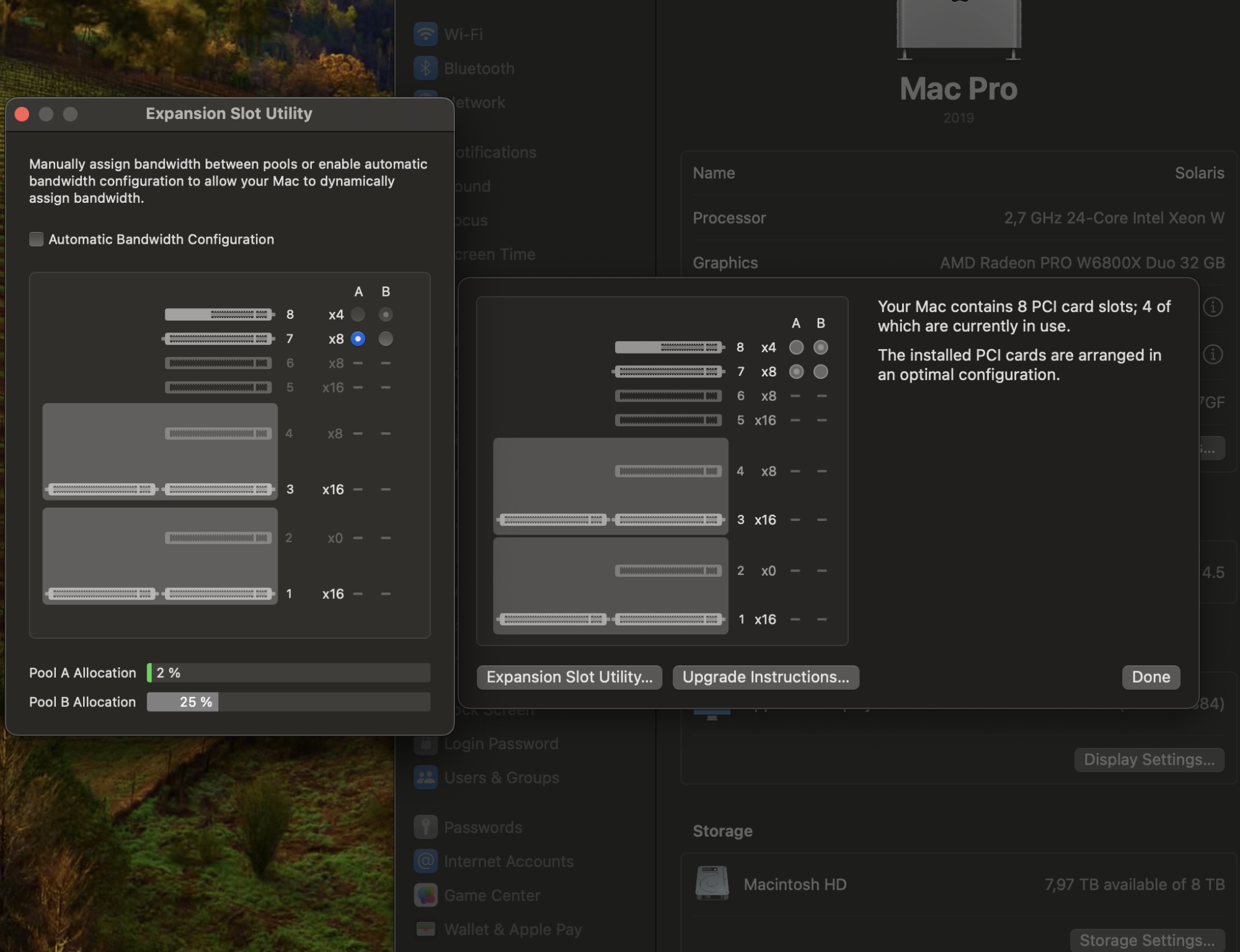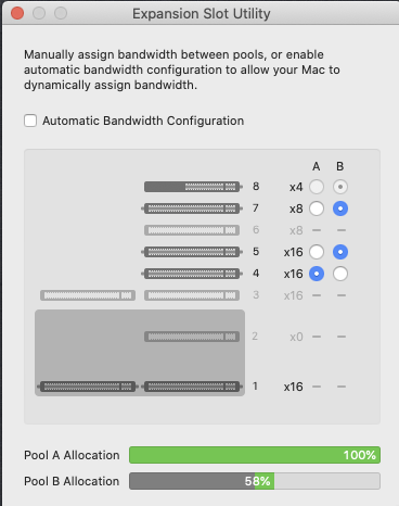 Thanks. I remembered seeing full pool allocations, and figured mine looked to low. Did search different threads, and see you are right.OK, well MPX Bay slots 1 & 3 aren't counted as part of Pool A or B - Your I/O card is using 4 lanes for built in Thunderbolt, which is 25% of the 16 lanes each pool has. What are you expecting to see?