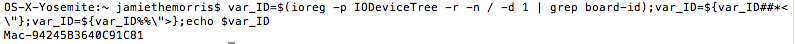 var_ID=$(ioreg -p IODeviceTree -r -n / -d 1 | grep board-id);var_ID=${var_ID##*<\"};var_ID=${var_ID%%\">};echo $var_ID