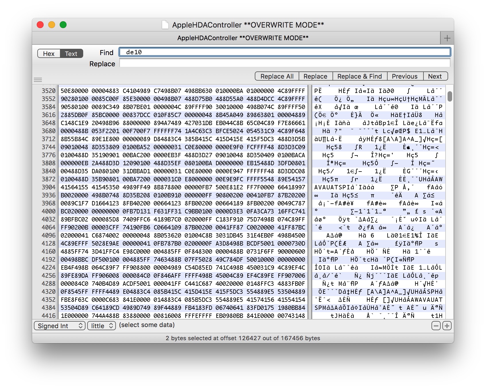 Replace the string de101a0e with de10abcd, whilst mine would say, replace the string 0210xxxx with 0210f0aa.