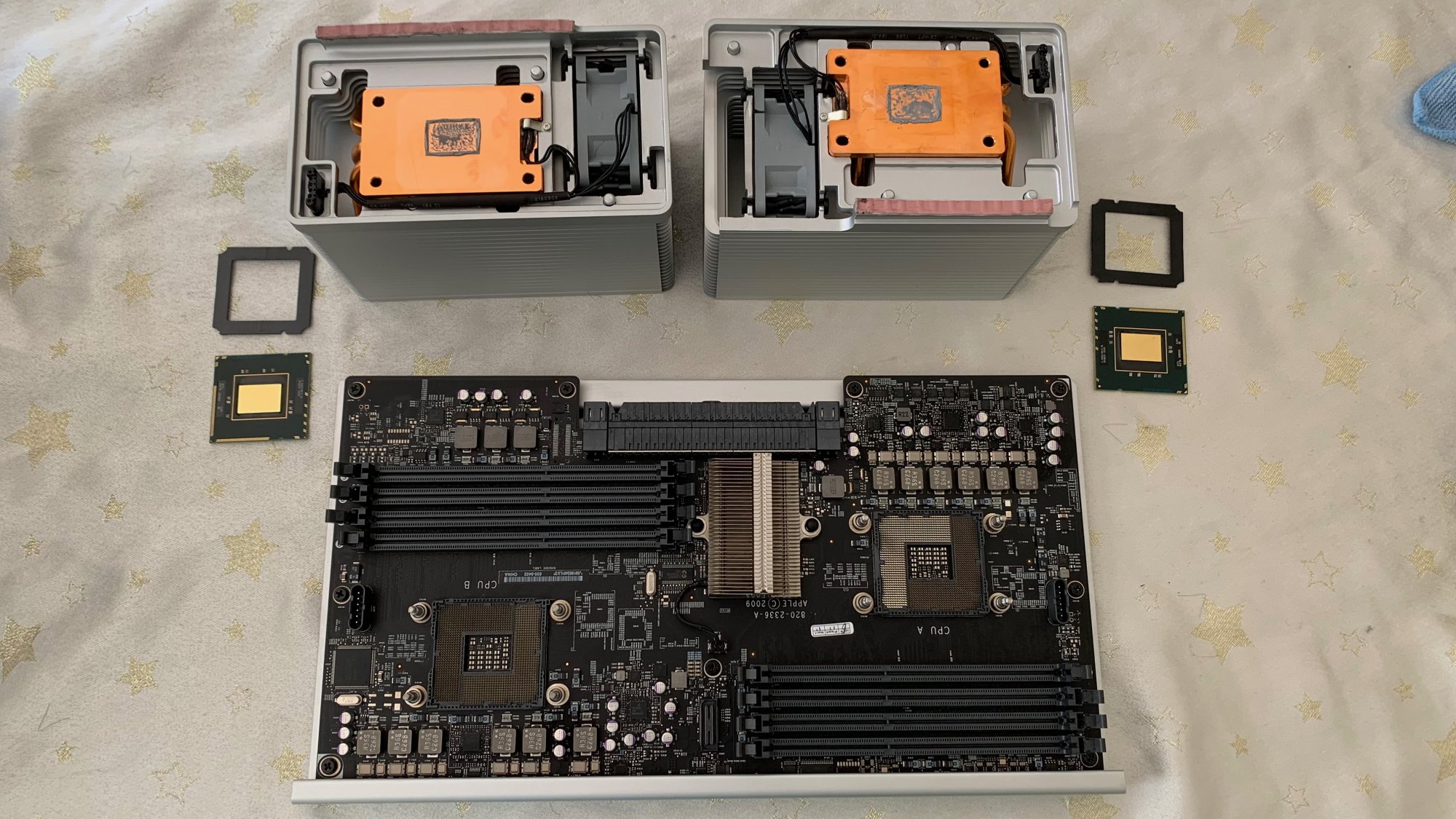 While cleaning, it's advisable to keep the old CPUs in the sockets to stop any dirt getting into the socket and also to protect the sockets mechanically. I taped the CPU down using Masking Tape.
