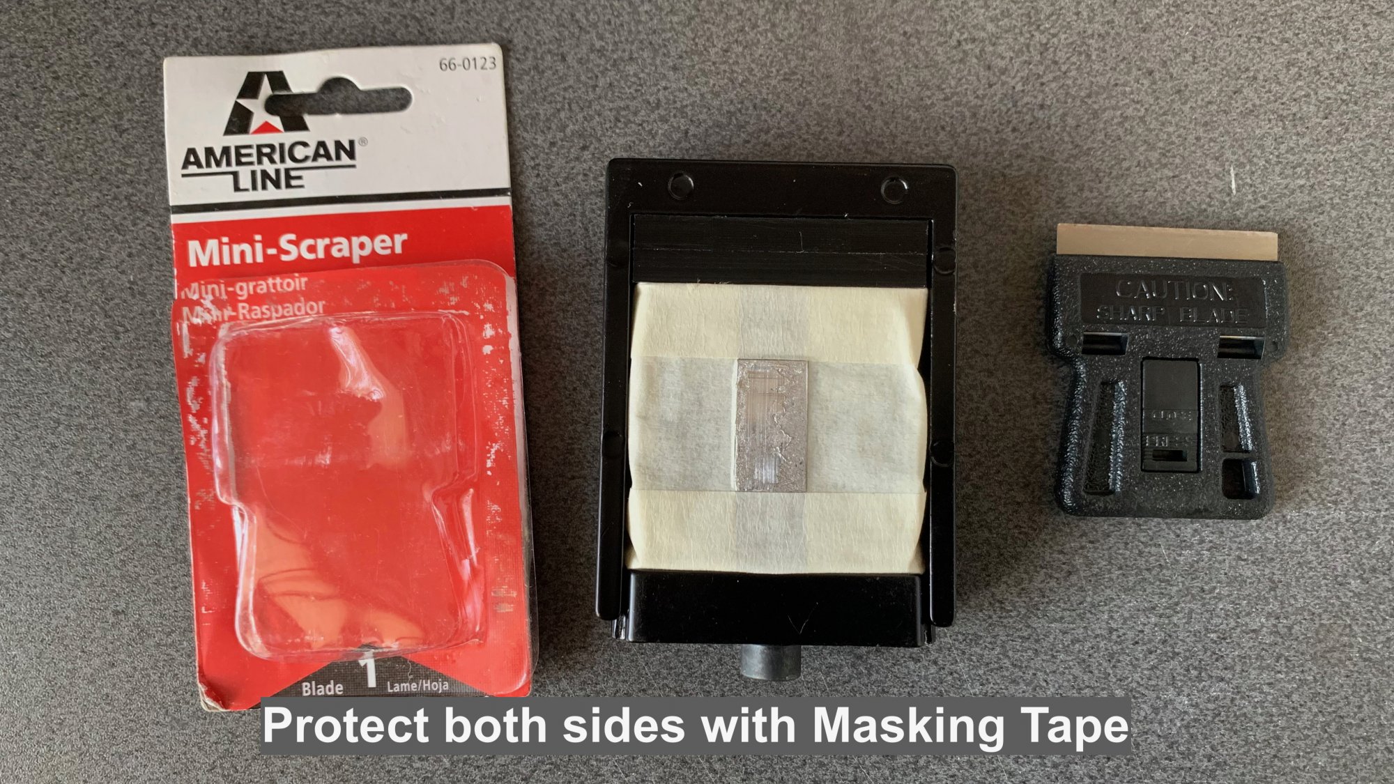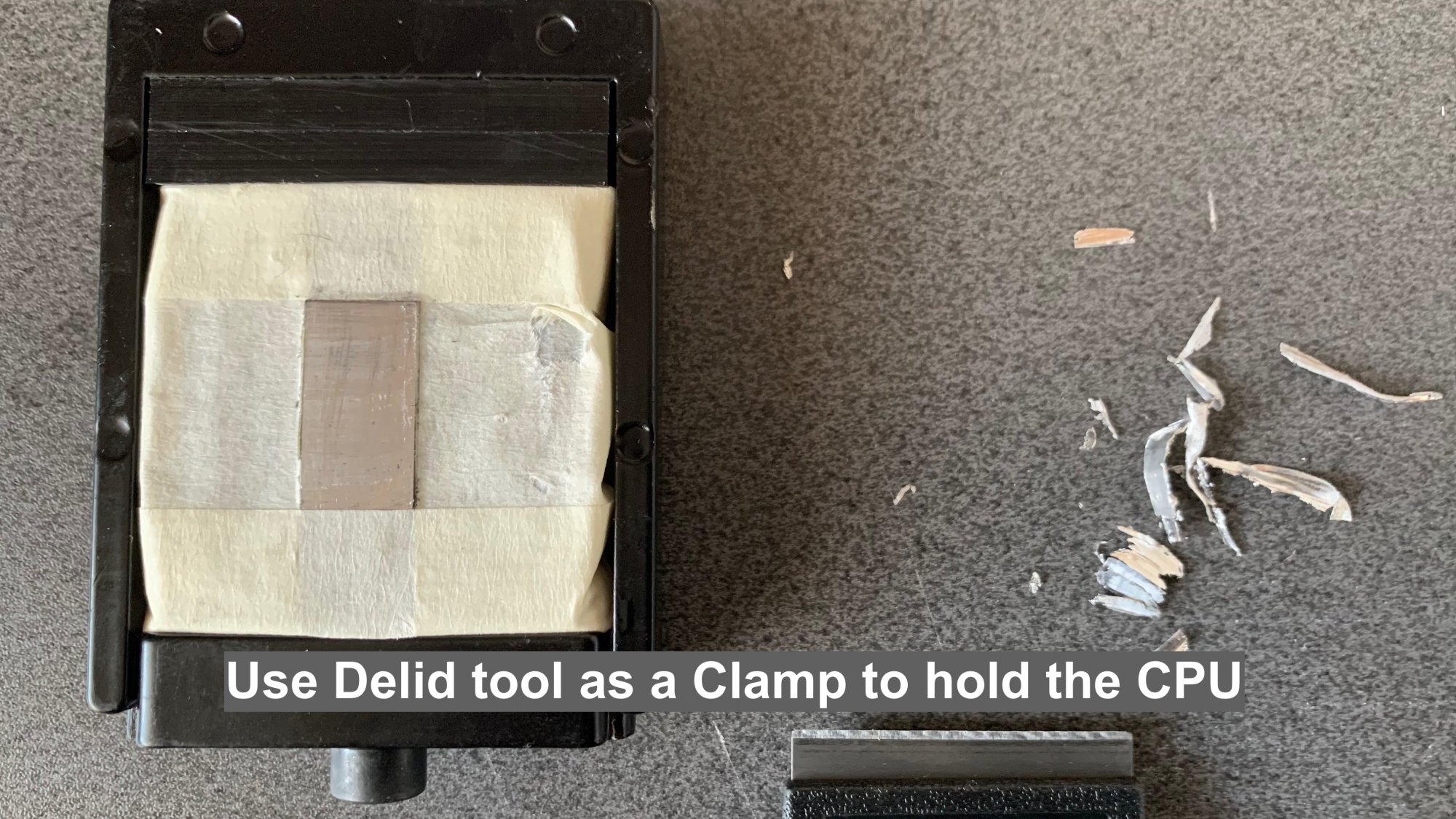 This helps on several fronts: (a) hold it flat; (b) keeps the bottom of the CPU off the table; (c) allows the tool can be wedged against something solid while scrapping the cpu Die: