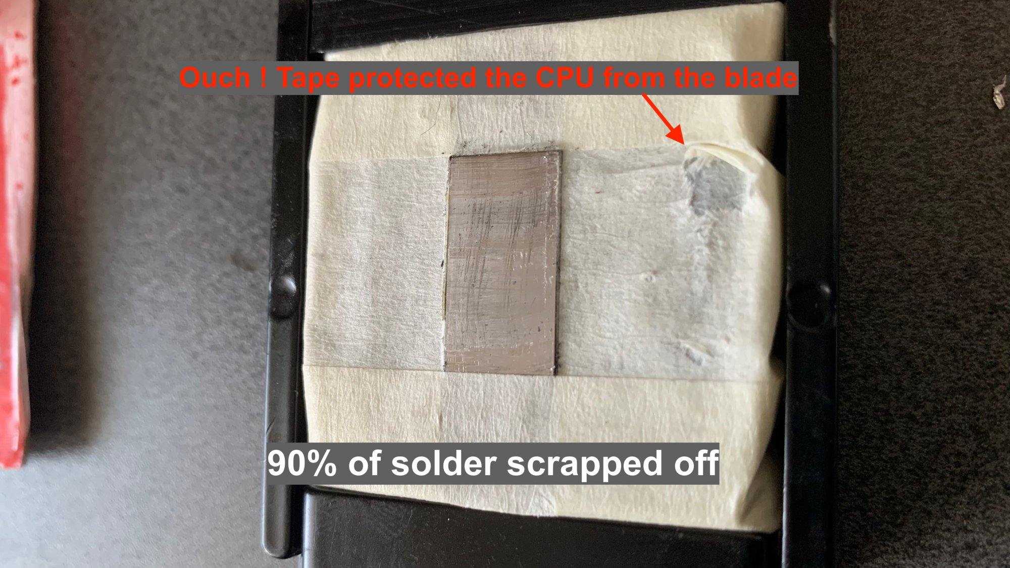 Protecting the CPU with tape proved it was necessary since no matter how careful one scraps, there's a chance that the blade will not be flat and as you can see in the above picture, I caught one end of the Cpu with the blade.