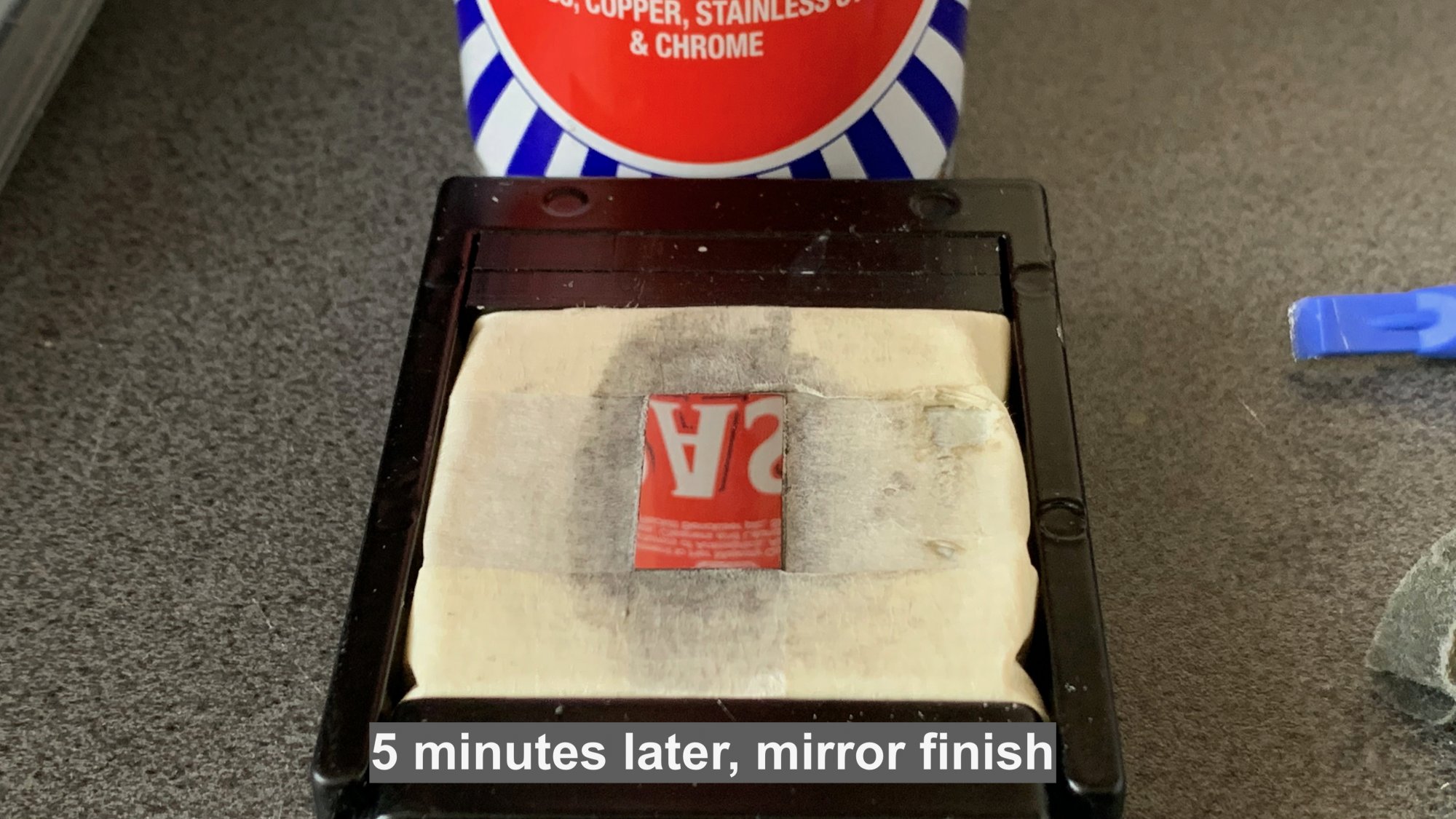 But I wondered if the sheen to could removed and polished. Rocket Cool used some American product Flitz which is a polisher. It is not readily available in the UK (it is but ridiculously expensive). I had a can of Brasso...a classic British metal polish and wondered if could remove the remaining residue :