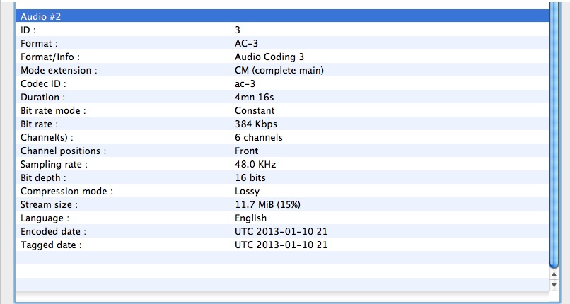 I did take a look at my program videospec and I figured out why it keeps saying two channel stereo. It only tells you the first channel in the basic mode. Plus I'm assuming because I'm playing it on my iMac which only has stereo that's the channel that is selected. I changed the view of the program and it shows you both channels. Dumb mistake on my part. Anyway the second channel is showing up as six channels ac3. So which will Apple TV?