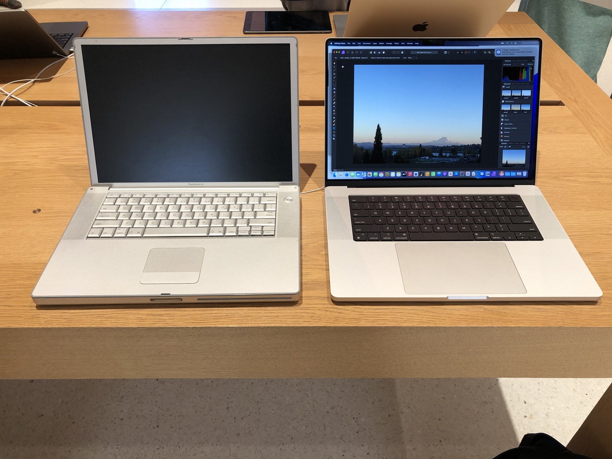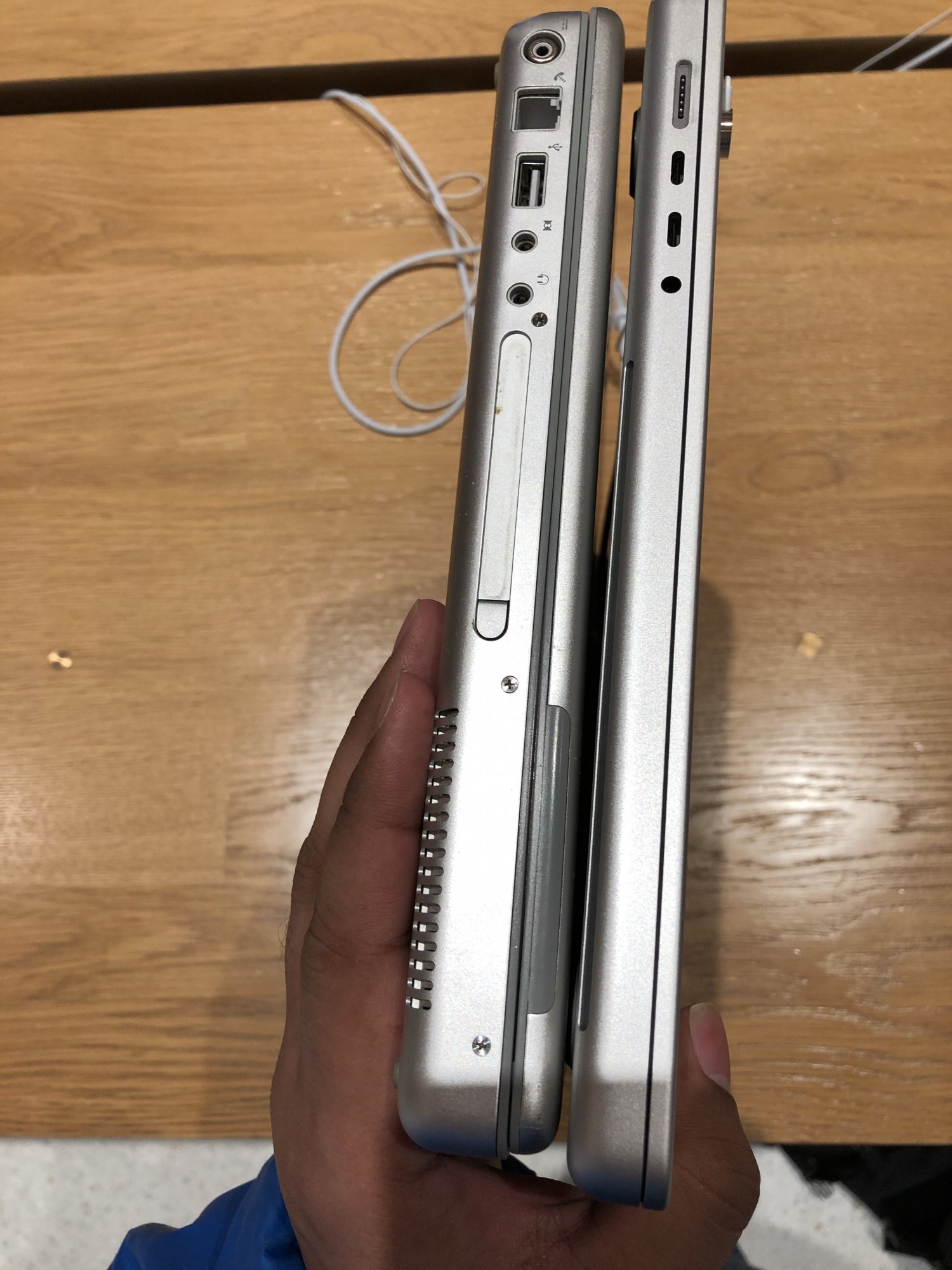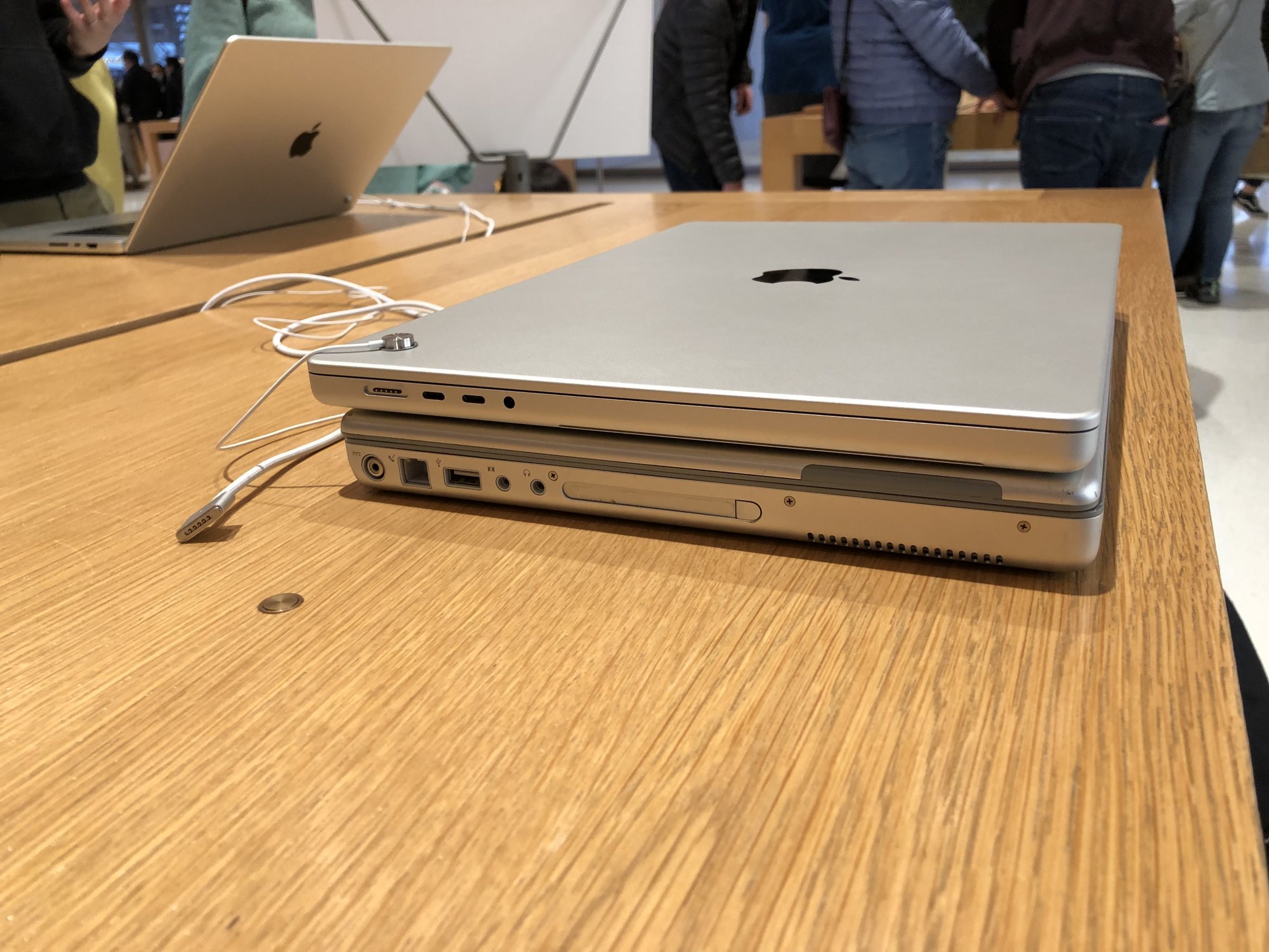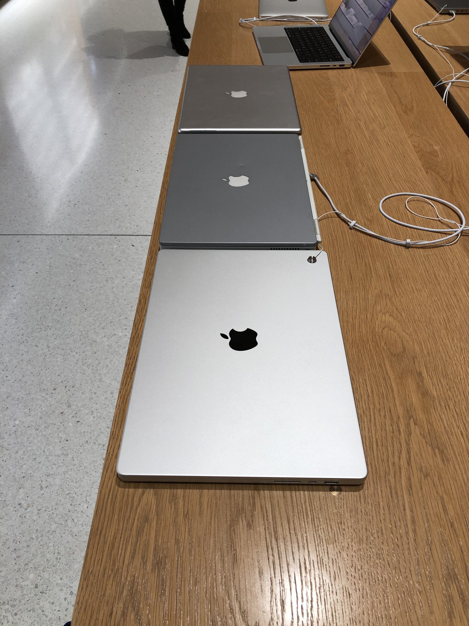 I brought a couple older PowerBook G4 devices to the store with me for comparison purposes, because this seemed to be the big talk when persons see the devices. To be honest, they are not that much alike, there is some DNA there, but thats about it. Grandpa in the middle there (Titanium). The 2021 16 inch is slightly bigger that both the 2001 and 2005 PowerBooks in the image below.