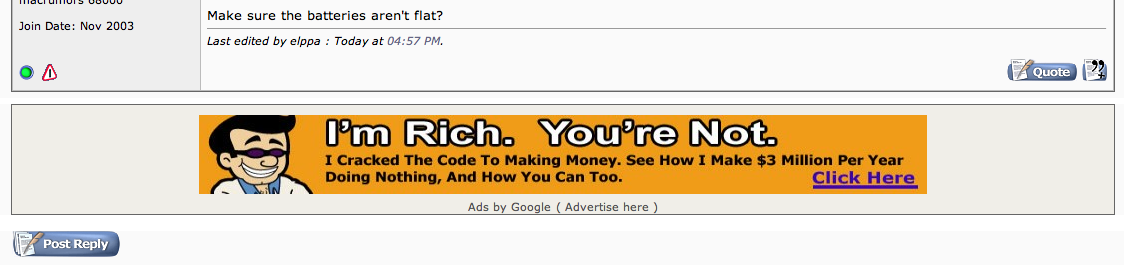This is kind of random, but browsing the forums I keep seeing an ad pop up for "I'm Rich. You're Not." Something about cracking the code to make money. Has anyone else noticed that the guy looks just like Leisure Suit Larry? Of classic PC game fame?
