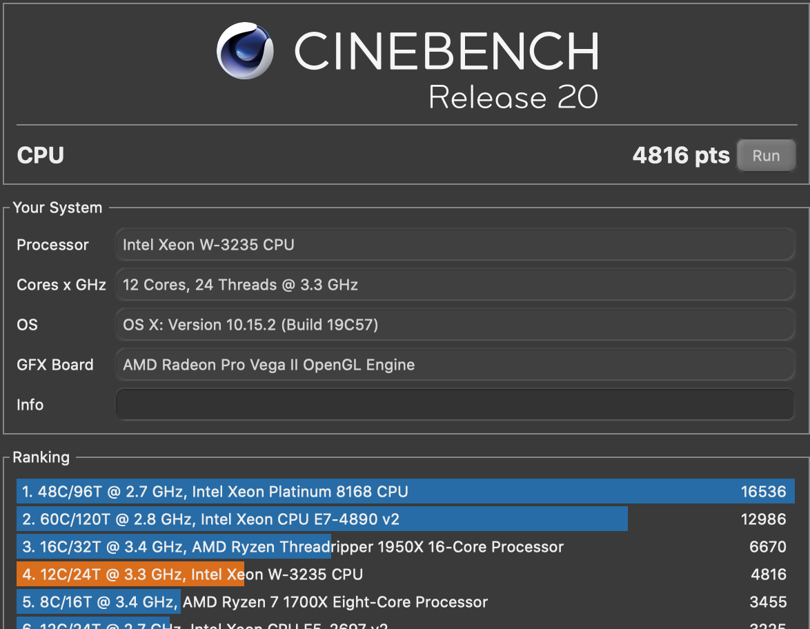 Here are scores from two different installed processors in the same Mac Pro 7,1 with 32 GB ( 4 x 8 GB ) .
