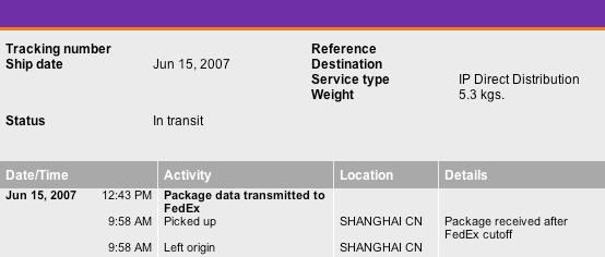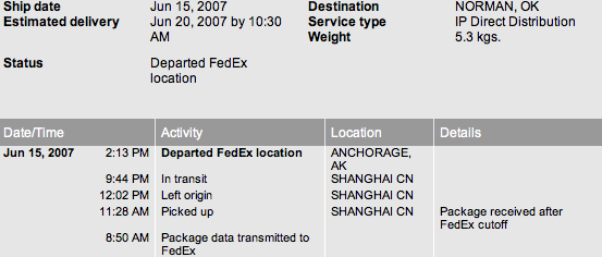 Well It appears that mine has just left the Anchorage, Alaska FedEx location. Hopefully it will get to Norman, OK before Wednesday.