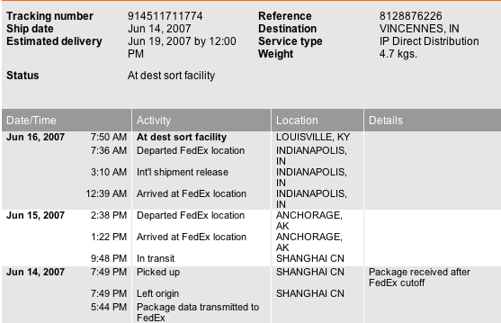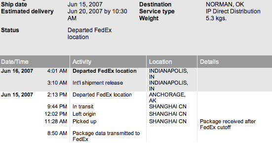 15 Jun 2007 23:16 Eindhoven Shipped From Originating Depot