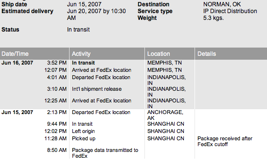 Estimated delivery......Jun 20, 2007 by 10:30 AM