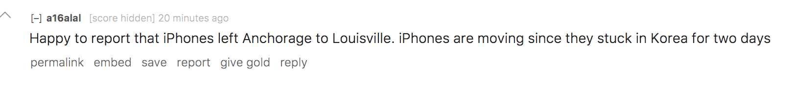 OK, so my phone that took the detour through Hong Kong has cleared in Anchorage... Hopefully it will get on one of the Louisville flights this afternoon, but UPS is still showing delivery the afternoon of the 14th.