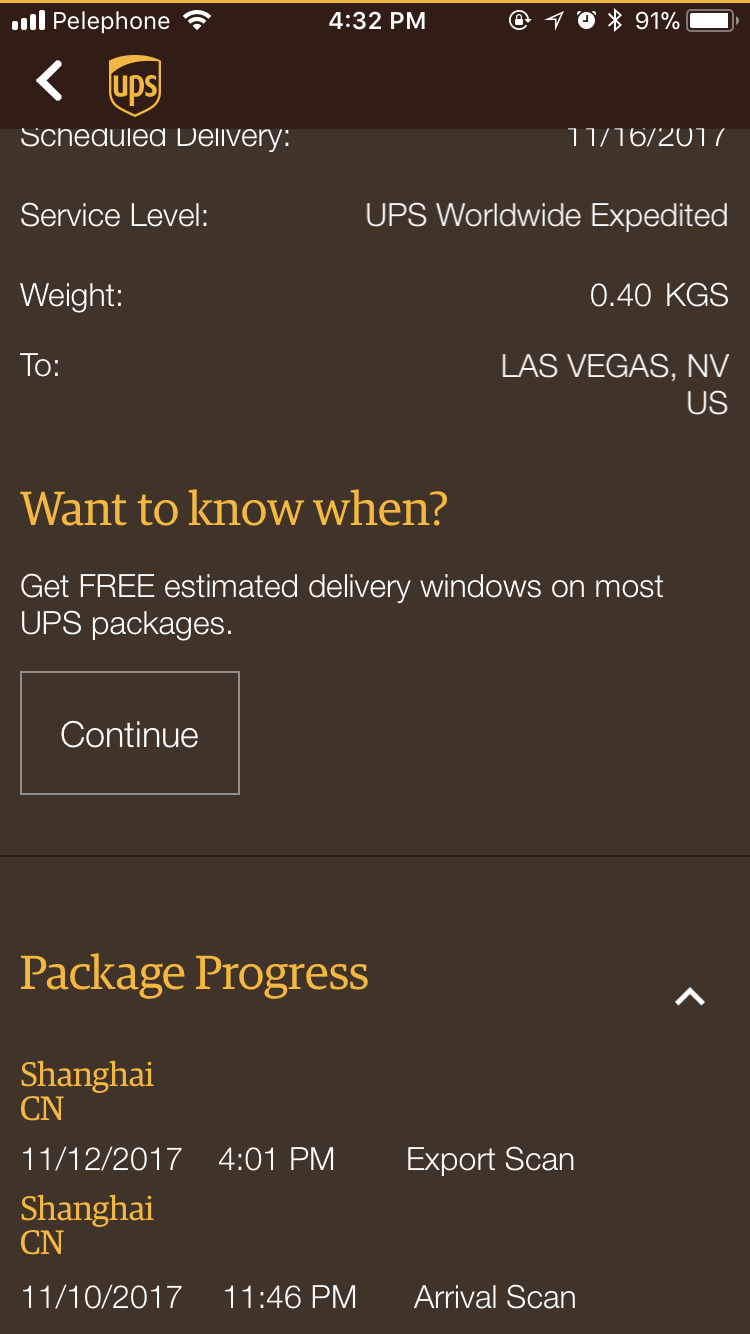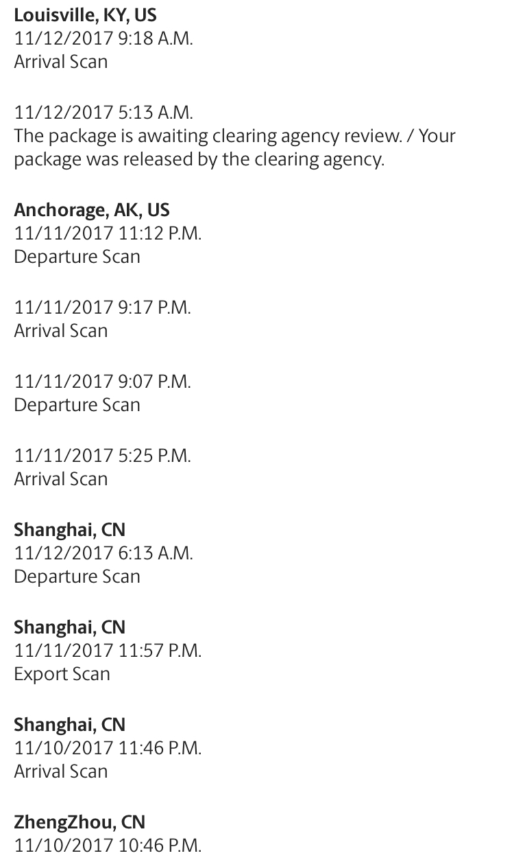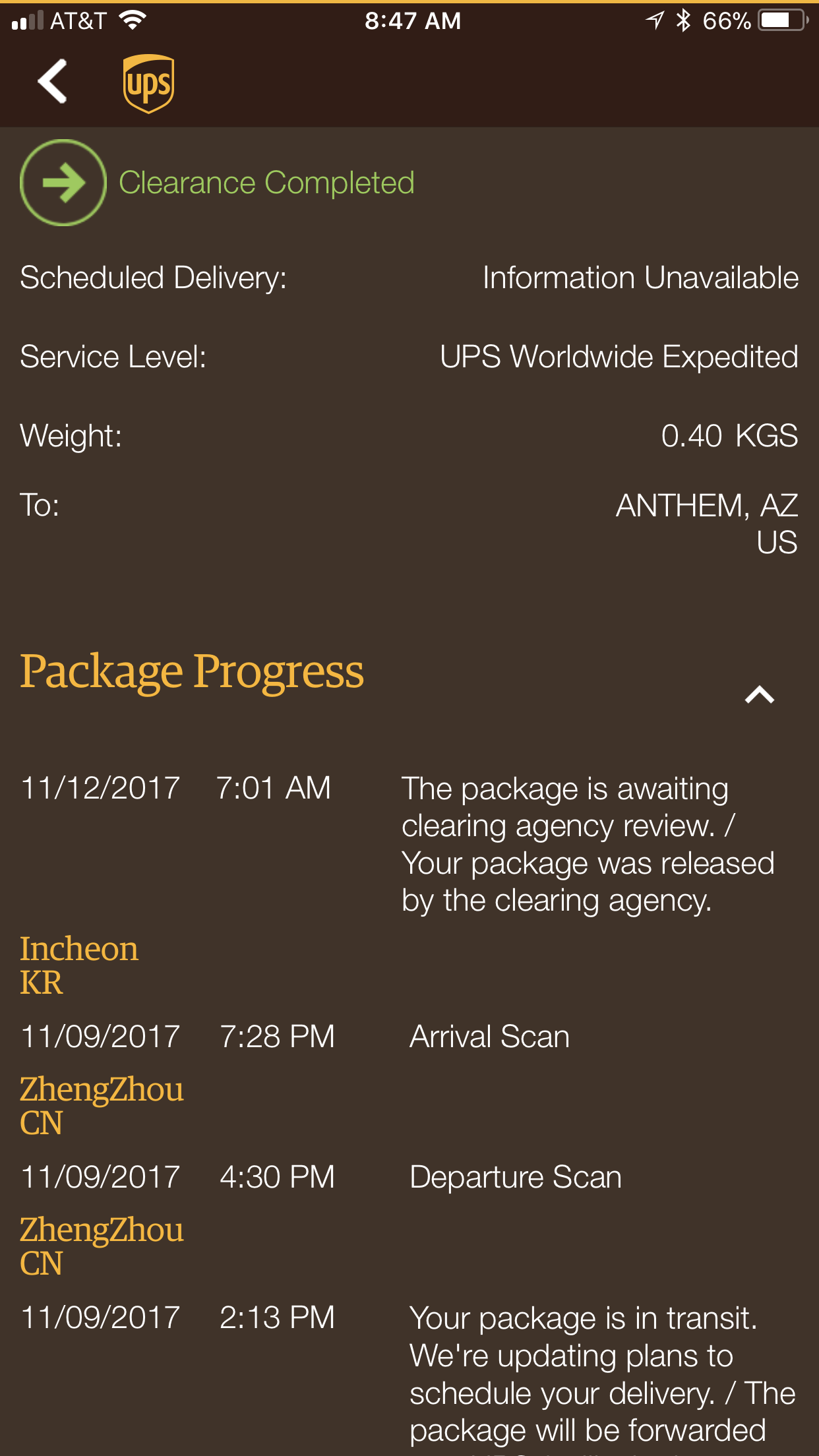 Finally moved past the agency clearance step I was stuck at since 8:56 am on 11/9 in ZhengZhou, but it just says "Your package is in transit. We're updating plans to schedule your delivery. / The package will be forwarded to a UPS facility in the destination city." Hopefully the next scan is in the US!