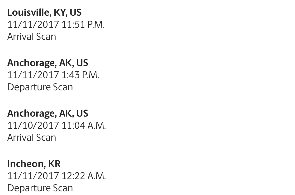 Last Location: Arrived - Incheon, Korea, Republic of, Thursday, 11/09/2017