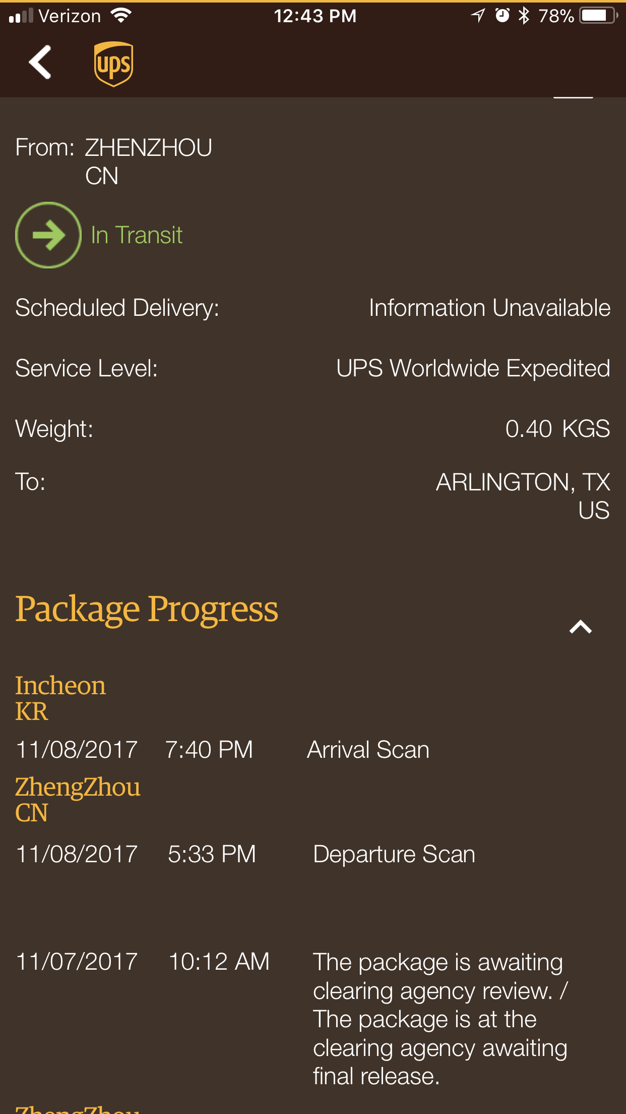 So after 5 days of sitting in Korea, but UPS still telling me I was “In transit: On Time” with delivery of 11/3, all of the sudden the status changed to just “In Transit” and delivery date unavailable. *braces for some really bad news*