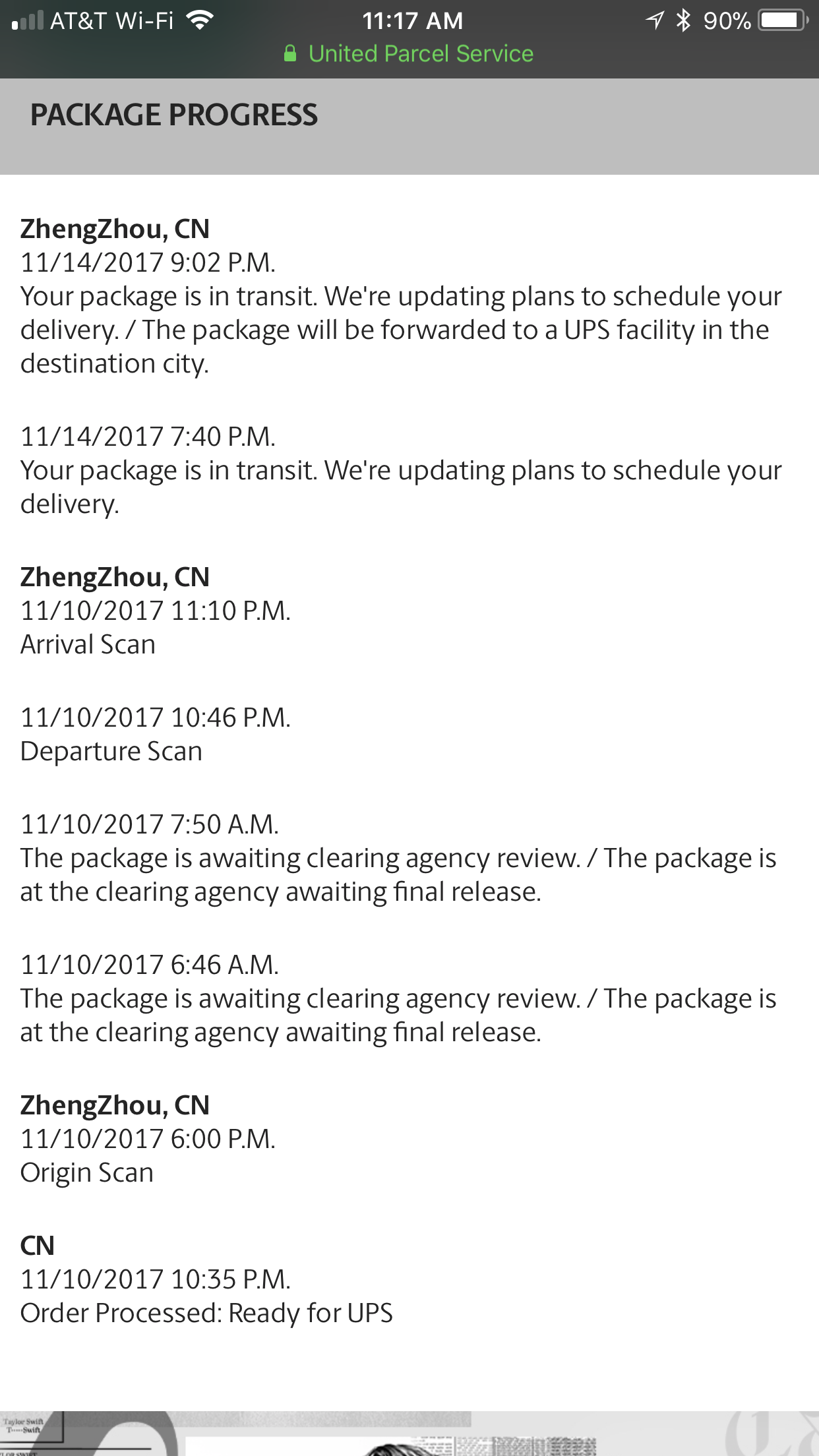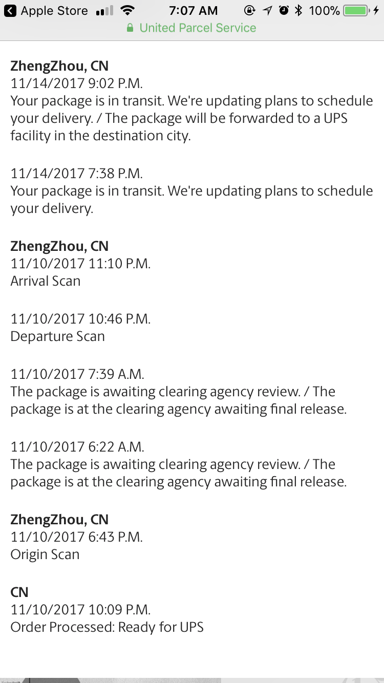 ZhengZhou, China 11/14/2017 9:19 P.M. Your package is in transit. We're updating plans to schedule your delivery. / The package will be forwarded to a UPS facility in the destination city.